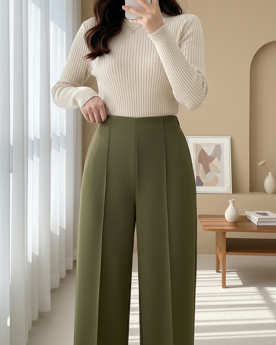 Bol Paça Çimalı İki İp Penye Pantolon -Haki-Haki