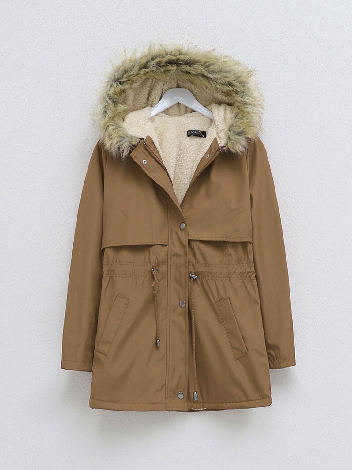 Bolero Detaylı Kürklü Kapşonlu İçi Peluşlu Mont -Taba-Taba