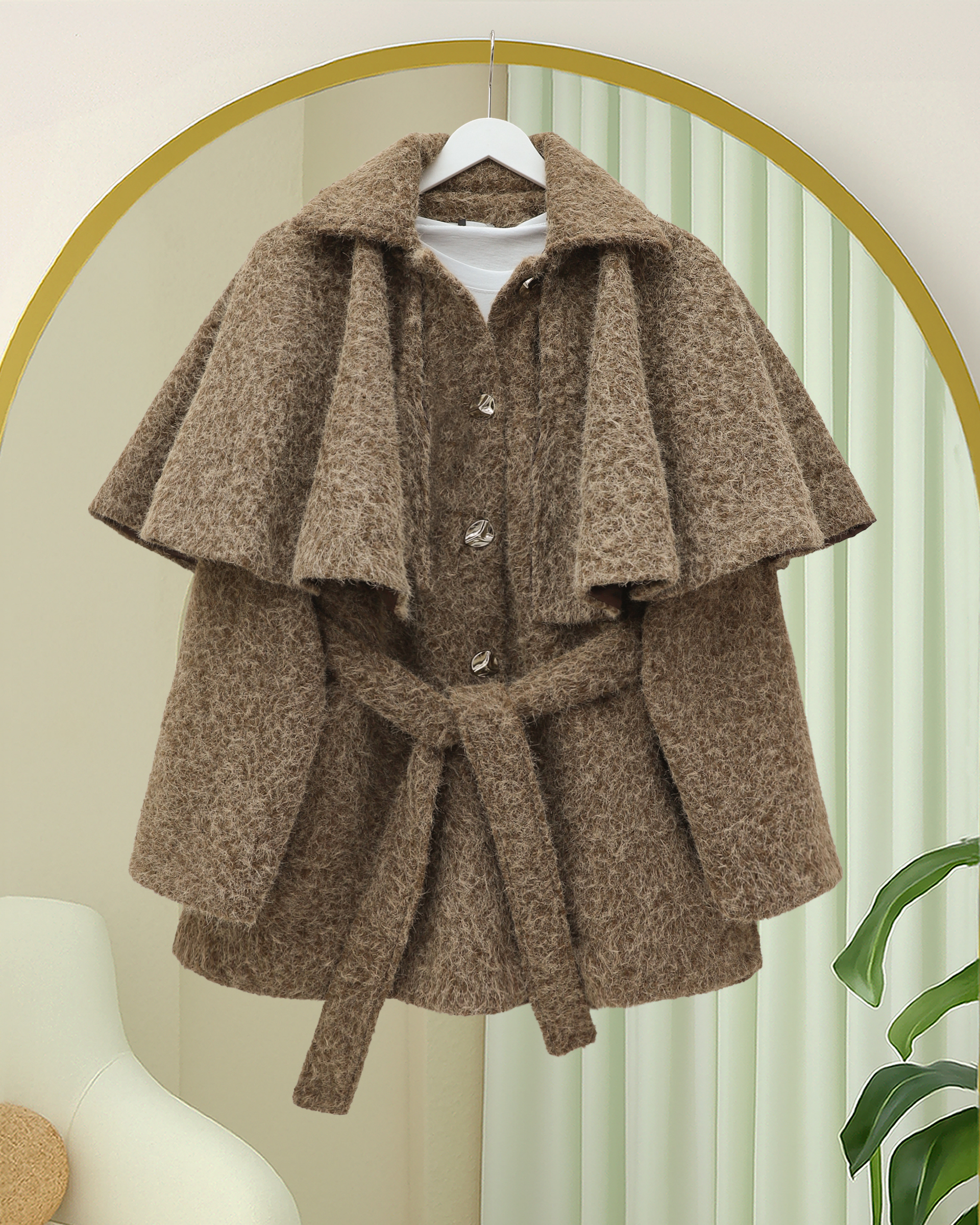Bolerolu Beli Kemerli Düğmeli Kaşe Kap -Açık Kahve-Açık Kahve
