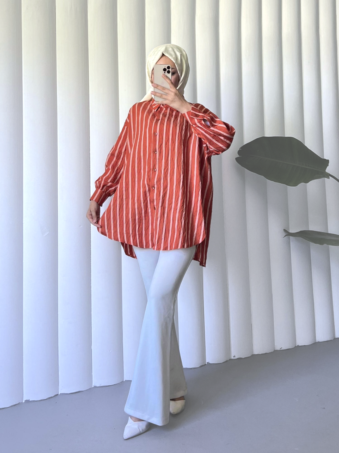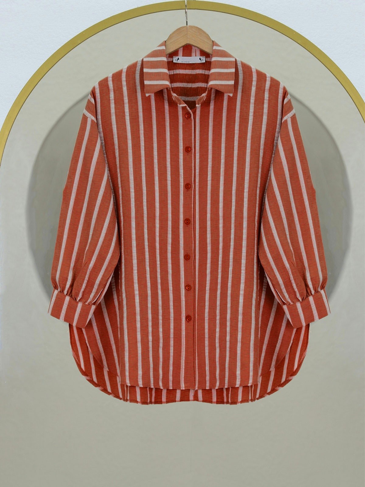Boydan Düğmeli Arkası Uzun Çizgili Gömlek -Kiremit-Kiremit