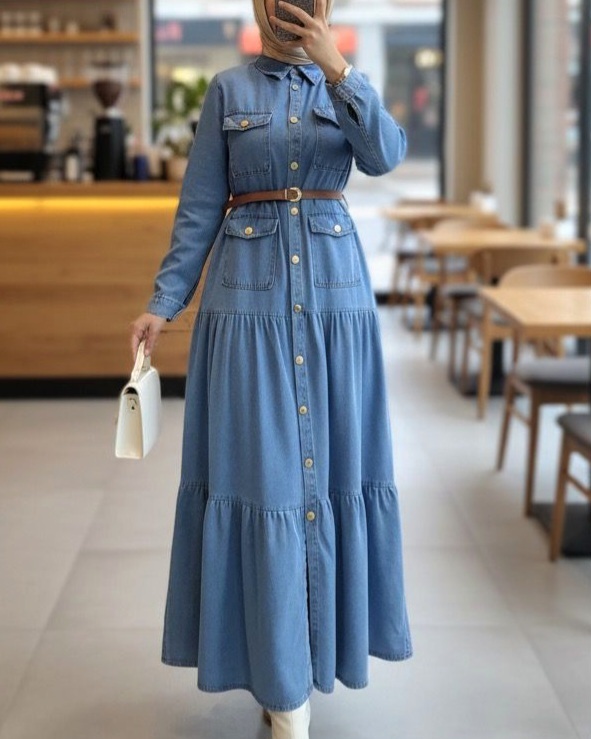 Boydan Düğmeli Cepli Kemerli Kot Elbise -Mavi-Mavi