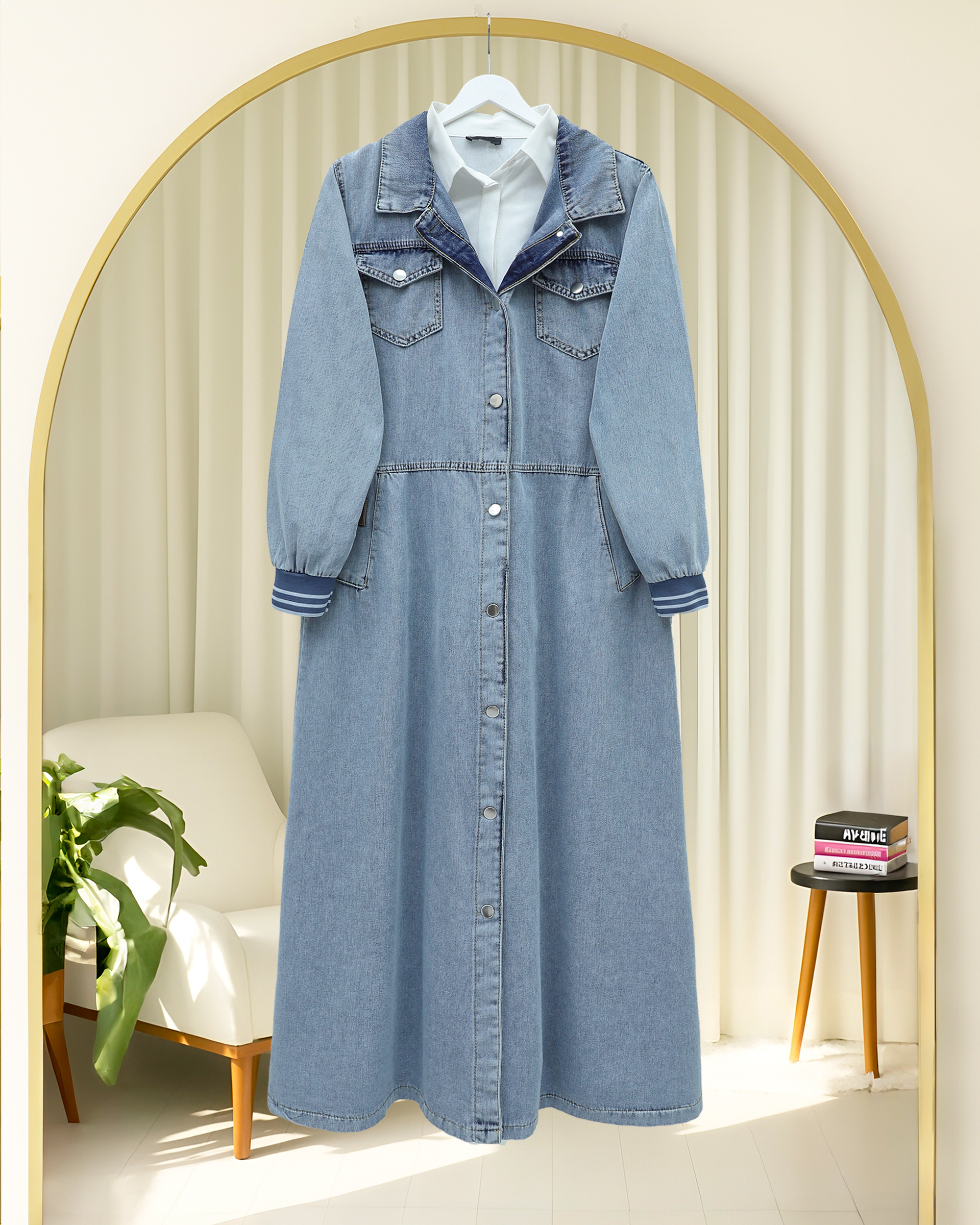 Boydan Düğmeli Cepli Kolu Ribanalı Kot Kap -Buz Mavi-Buz Mavi
