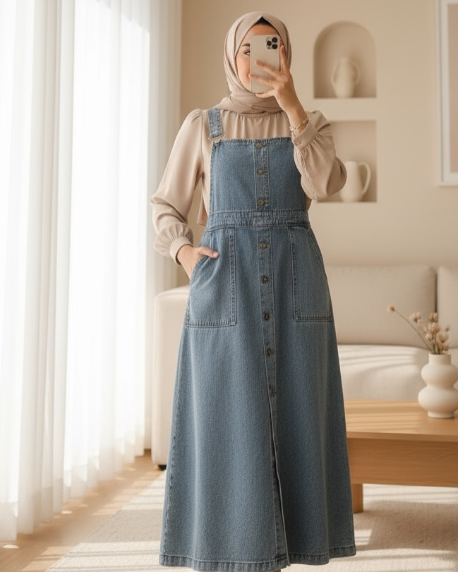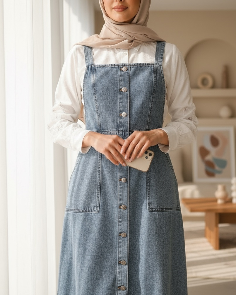 Boydan Düğmeli Çift Cepli Kot Salopet -Buz Mavi-Buz Mavi
