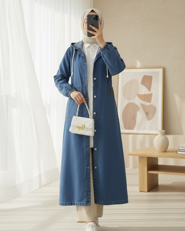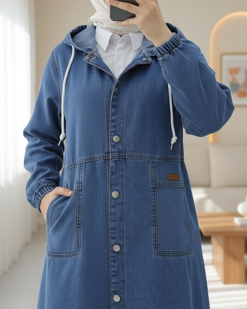 Boydan Düğmeli Kapşonlu Katlama Cepli Kot Kap -Mavi-Mavi