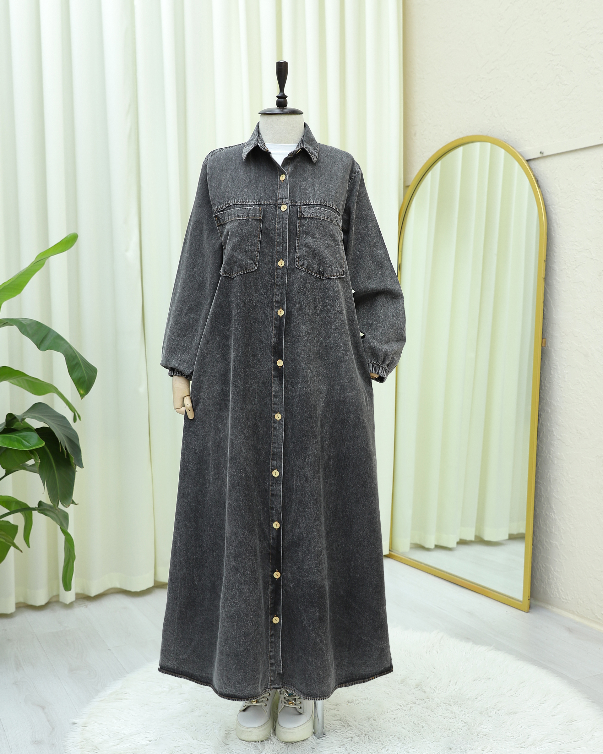 Boydan Düğmeli Kolu Lastikli Cepli Kot Elbise -Füme-Füme