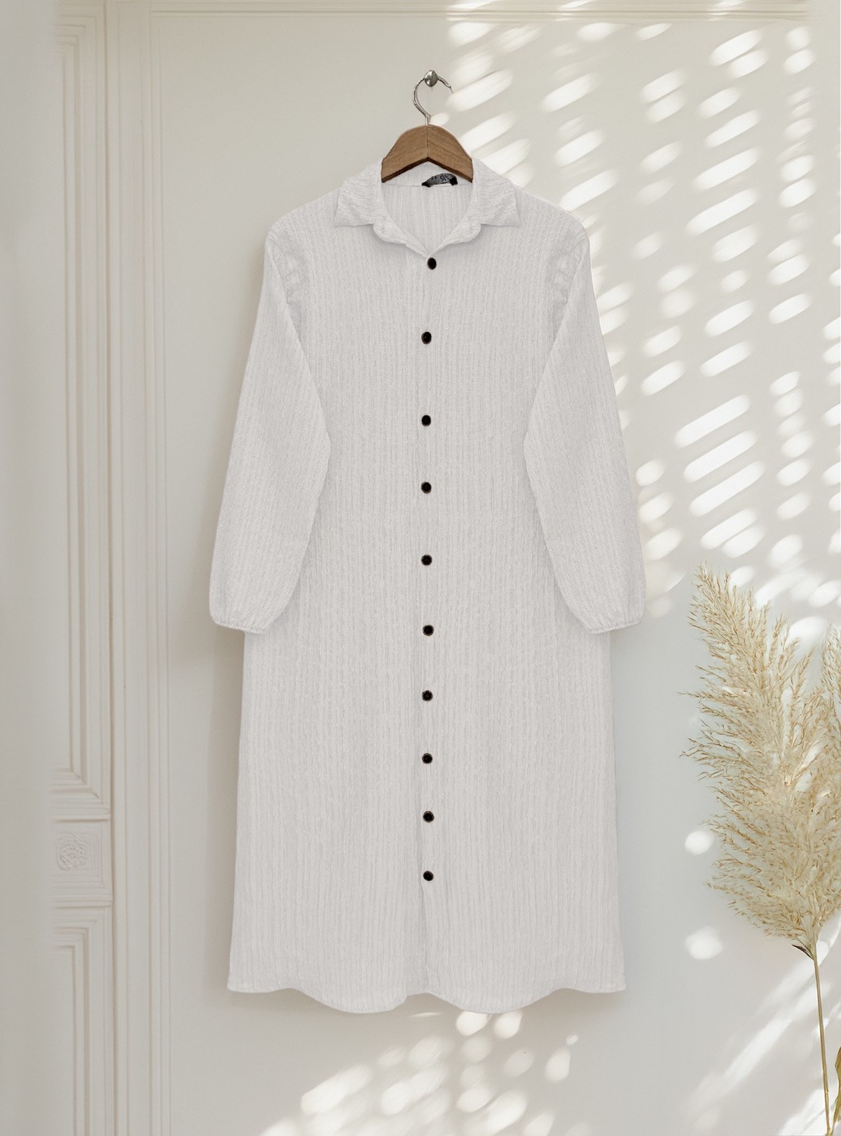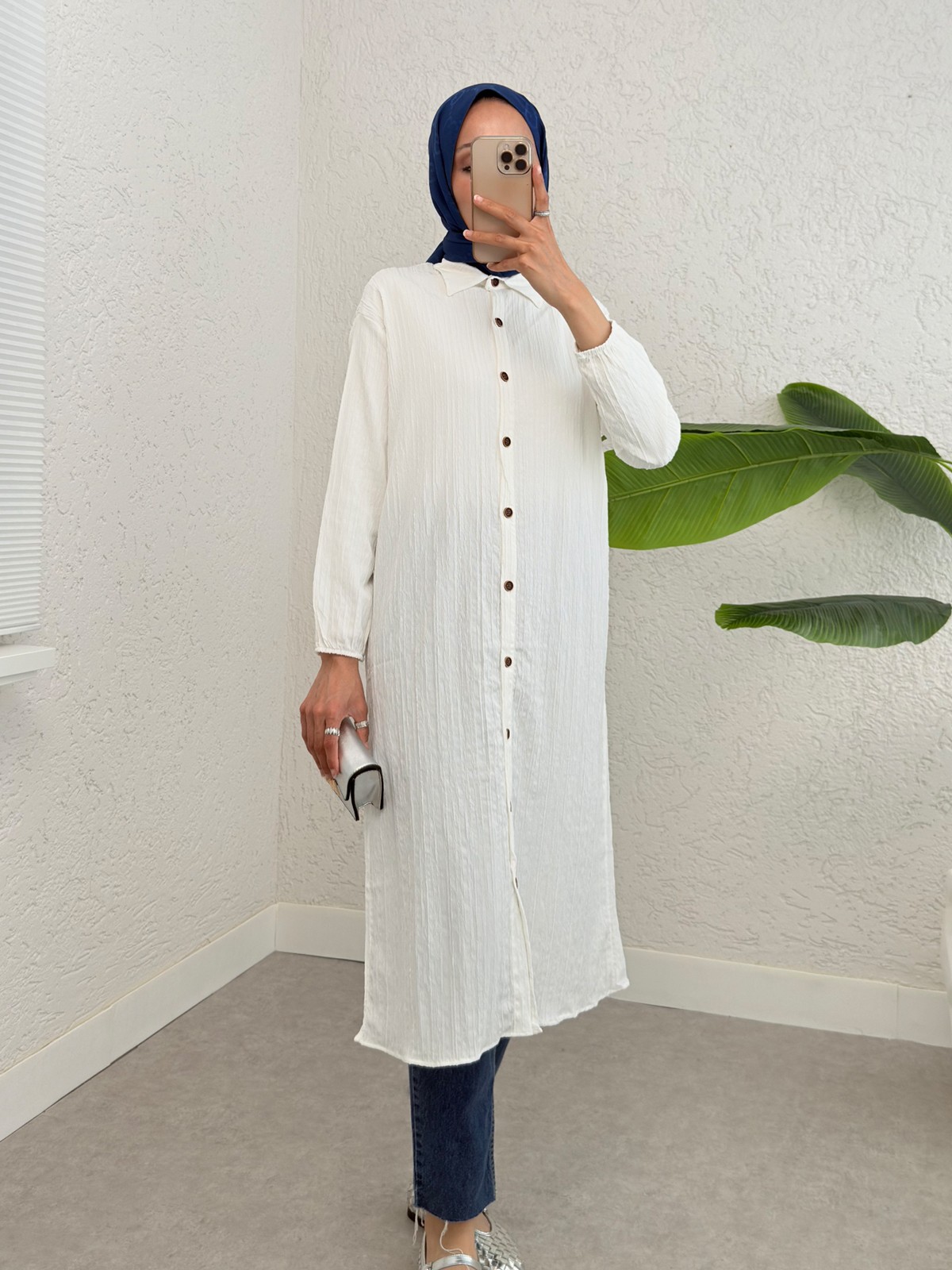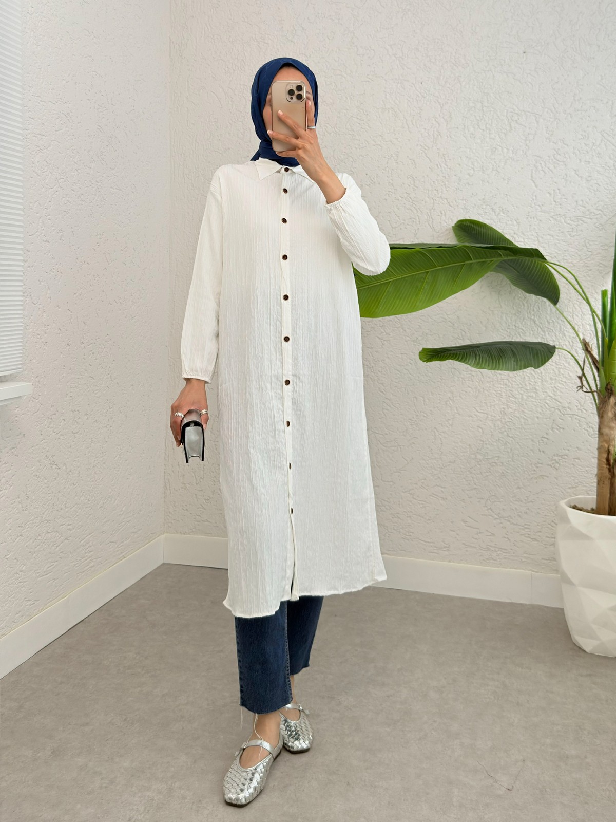 Boydan Düğmeli Kolu Lastikli Uzun Krinkıl Tunik -Beyaz-Beyaz