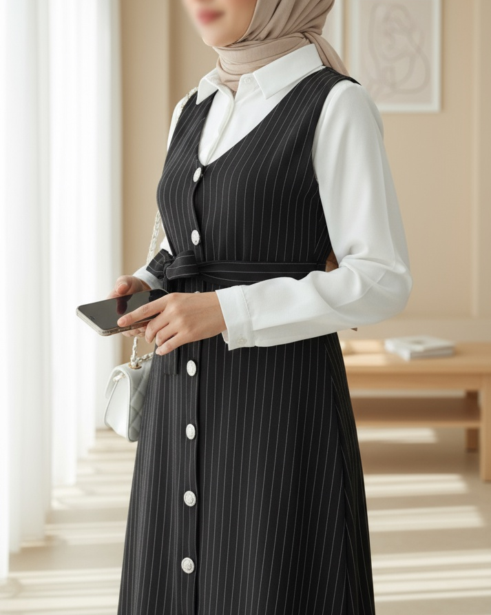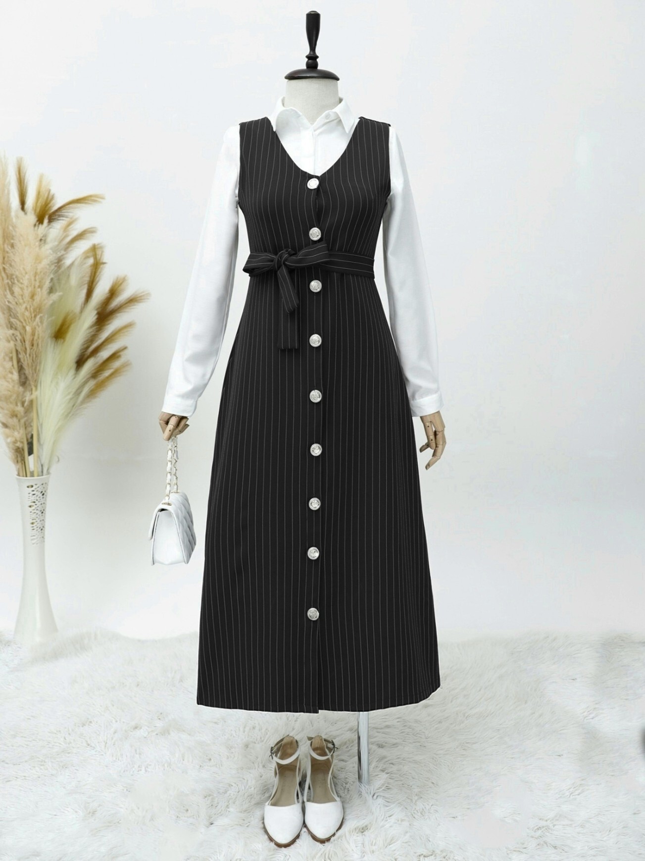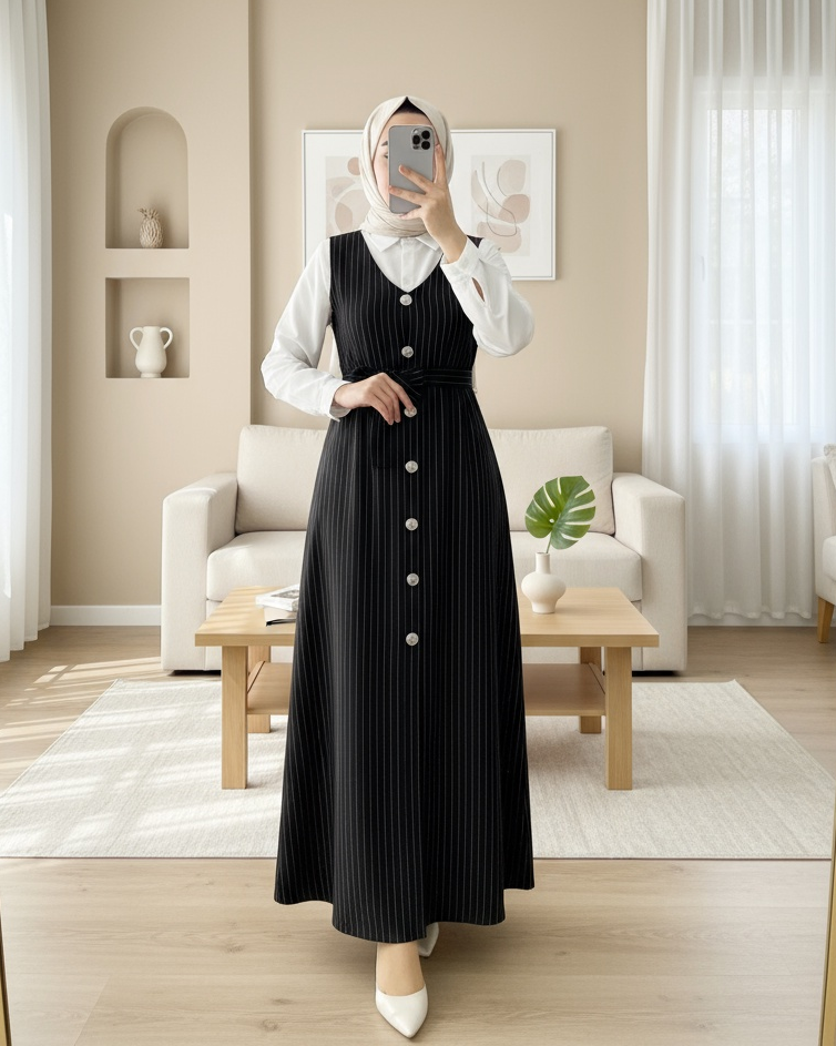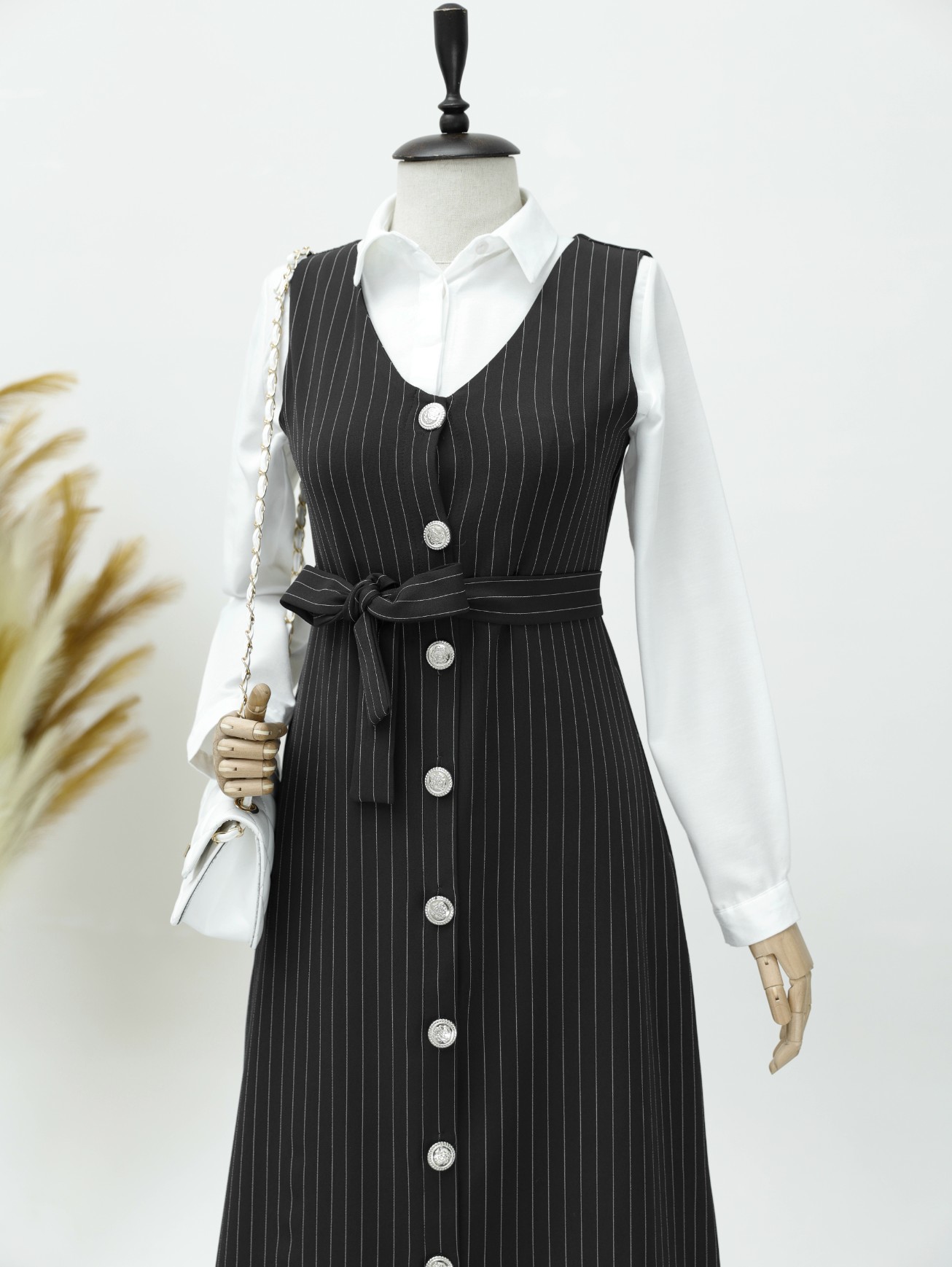 Boydan Düğmeli Kuşaklı Çizgili Jile -Siyah-Siyah