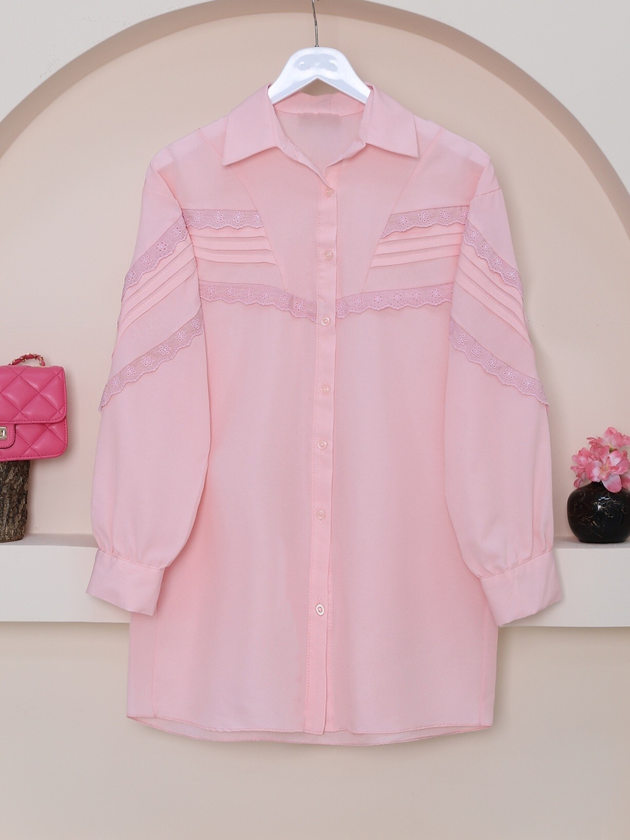 Boydan Düğmeli Omuzu Ve Önü Fistolu Gömlek -Pudra-Pudra