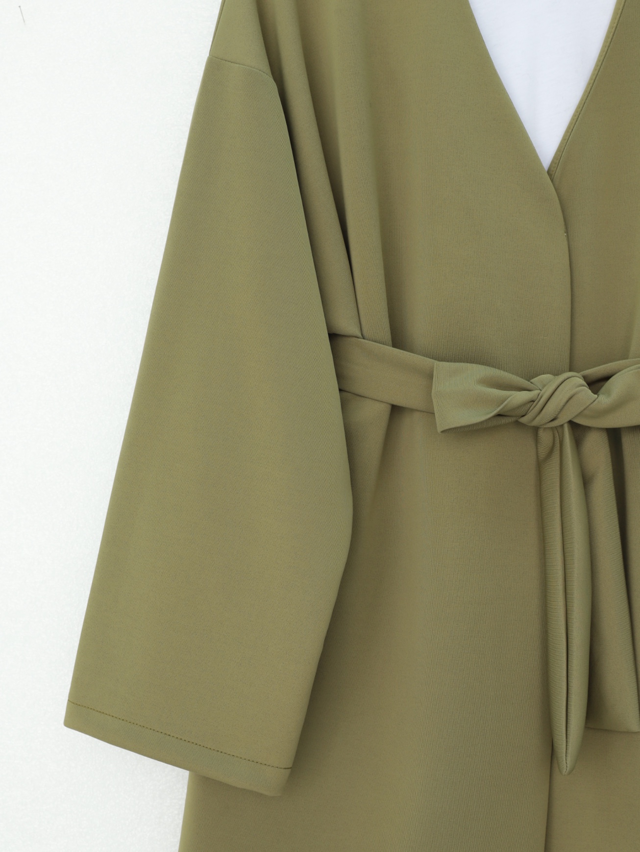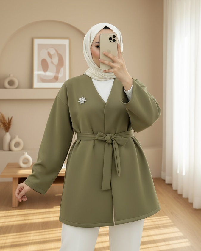 Broş Detaylı Beli Kuşaklı Scuba Ceket -Zeytin-Diğer