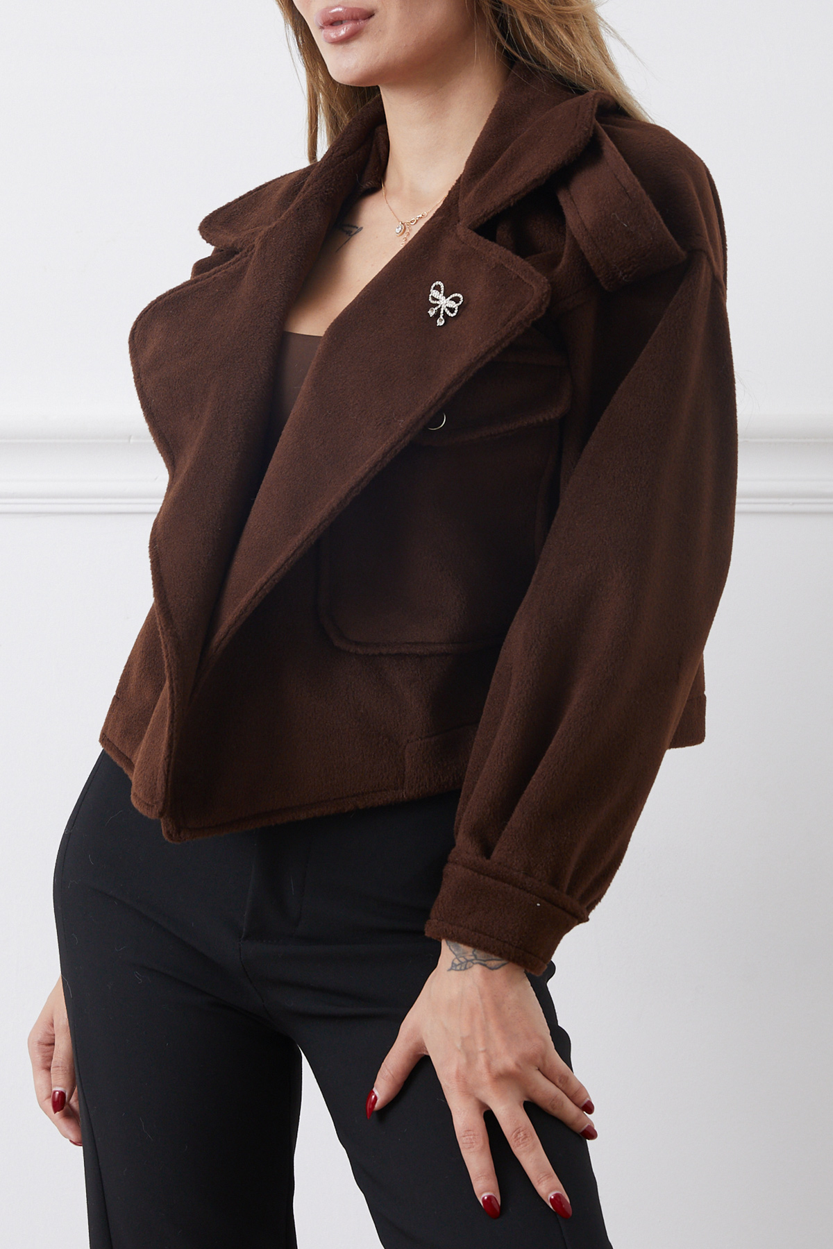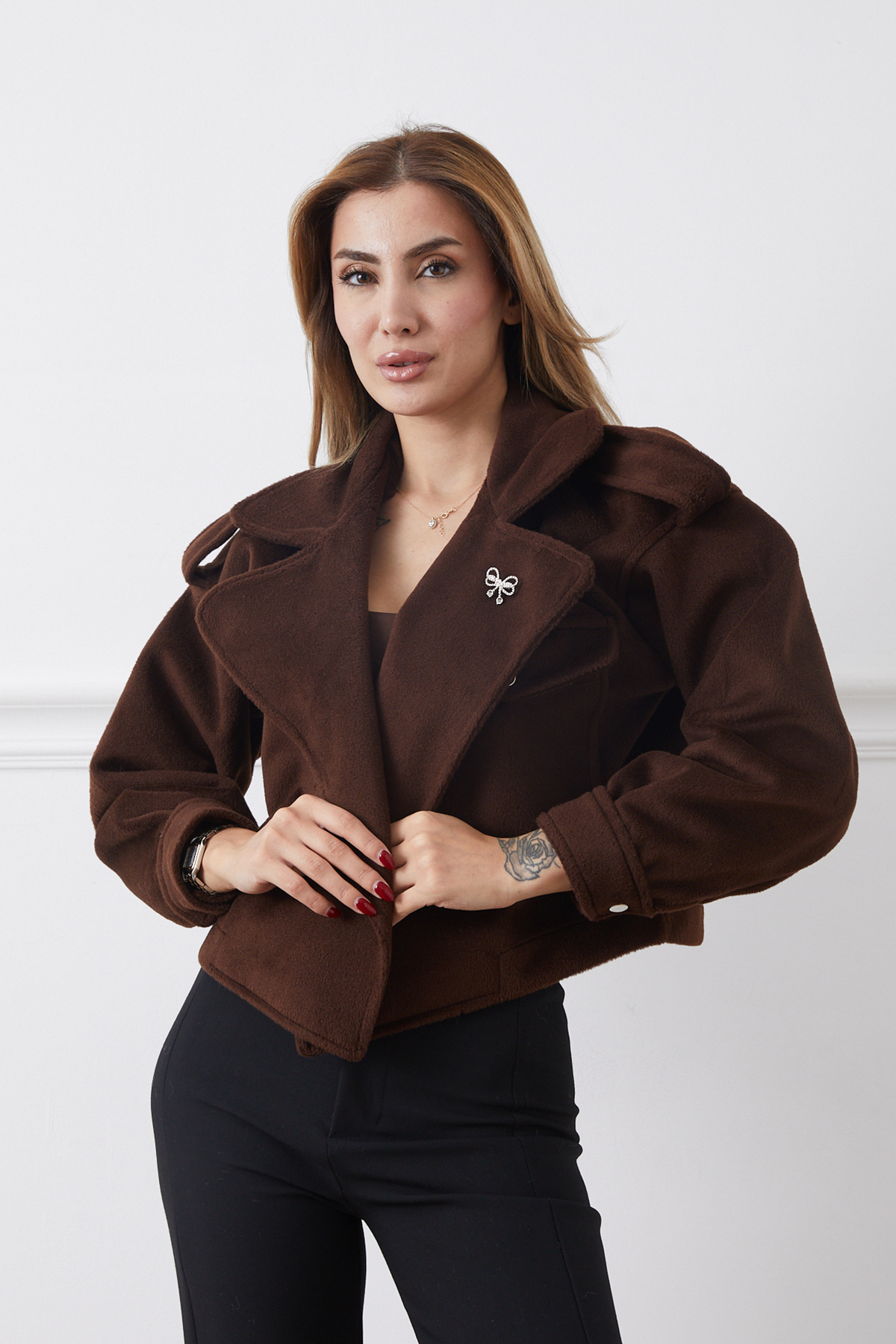 Broş Detaylı Tek Cepli Kısa Kaşe Ceket-Kahve