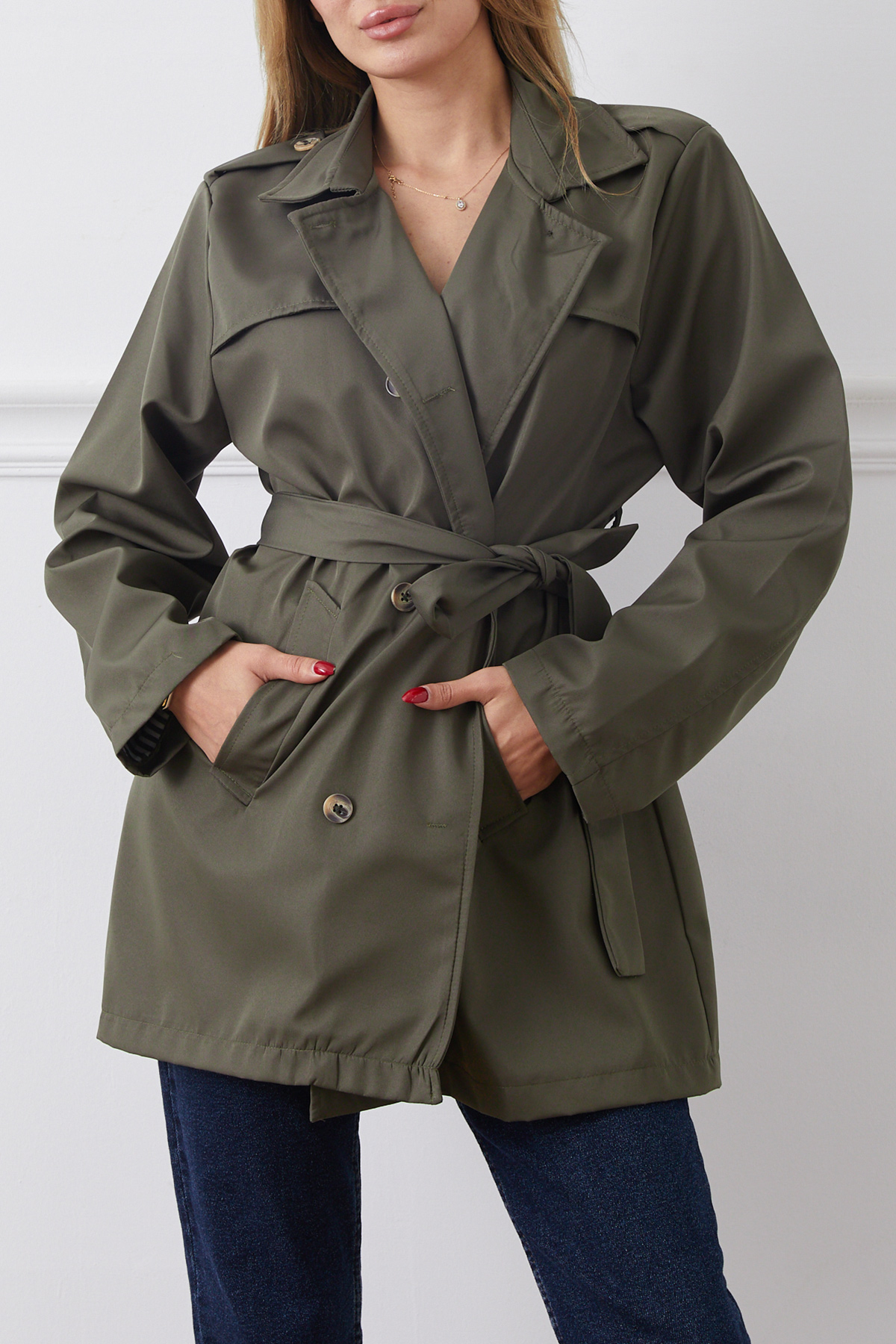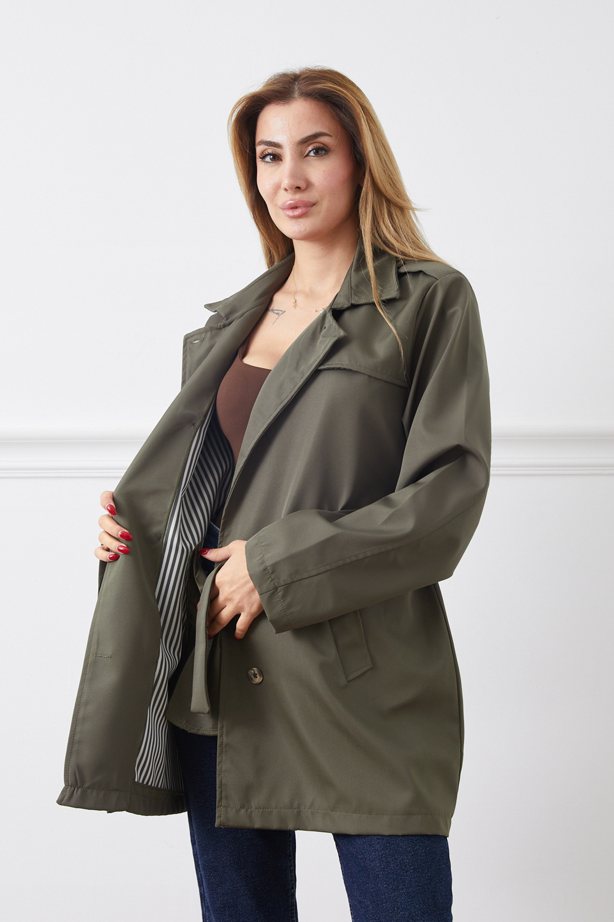 Büyük Beden Beli Kuşaklı Düğmeli Trençkot-Haki