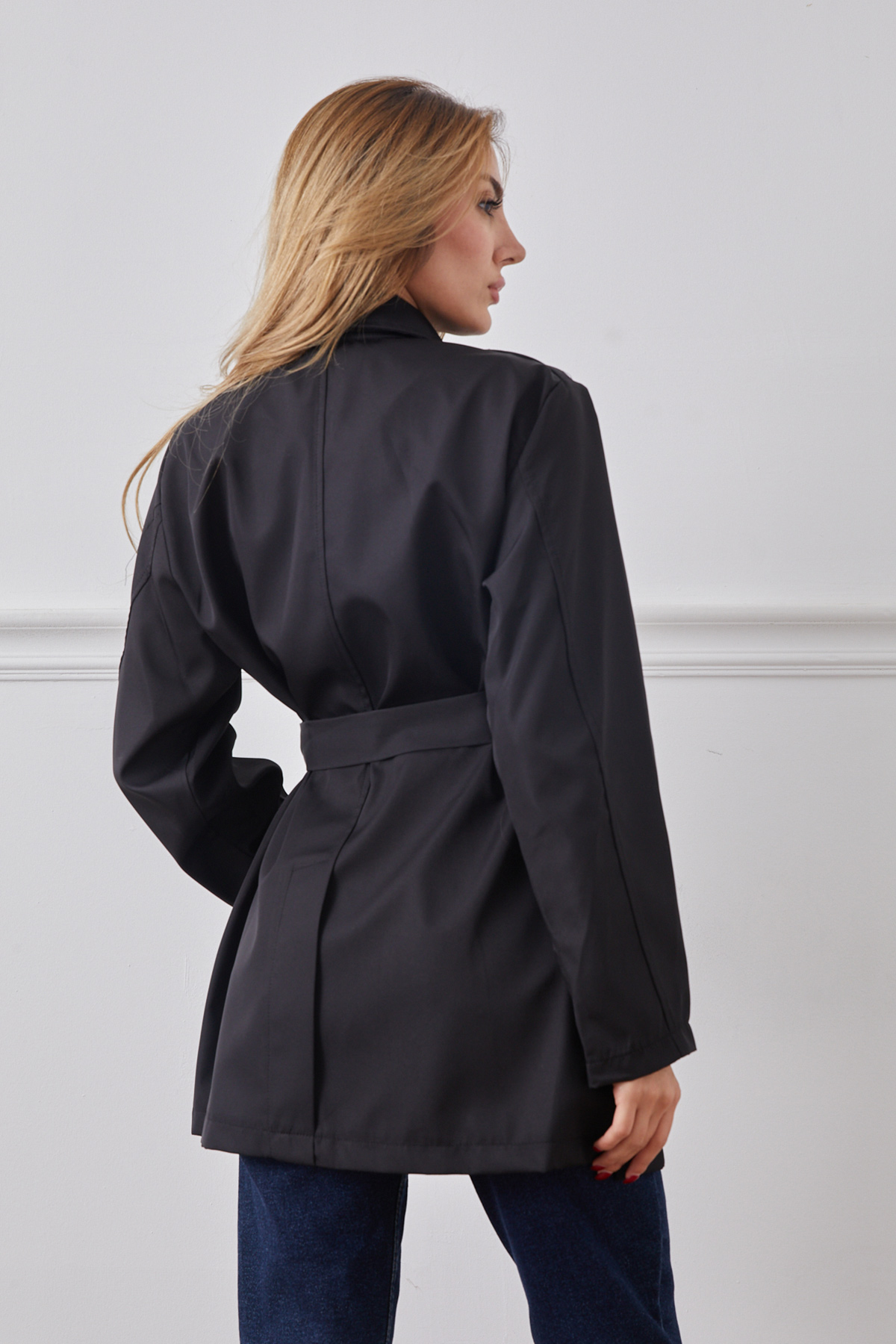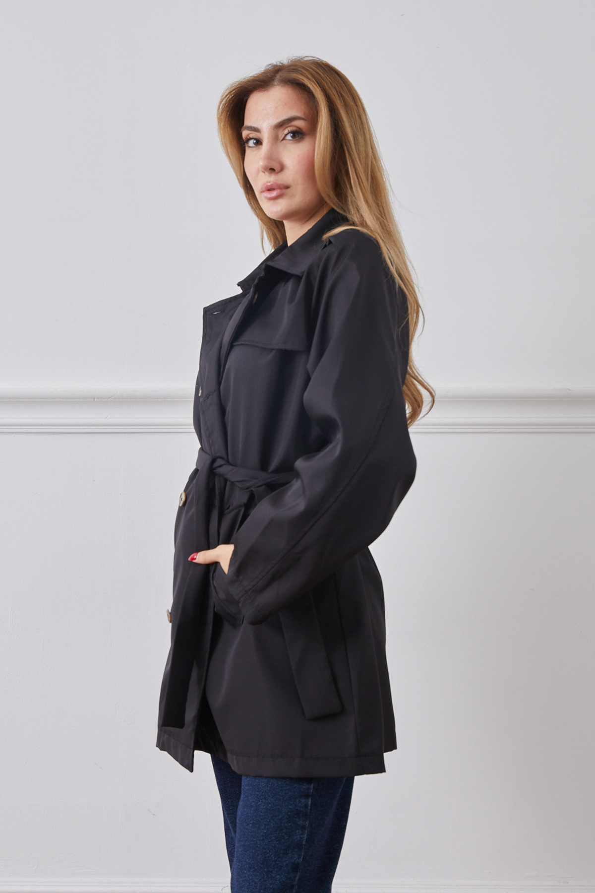 Büyük Beden Beli Kuşaklı Düğmeli Trençkot-Siyah - Beyaz