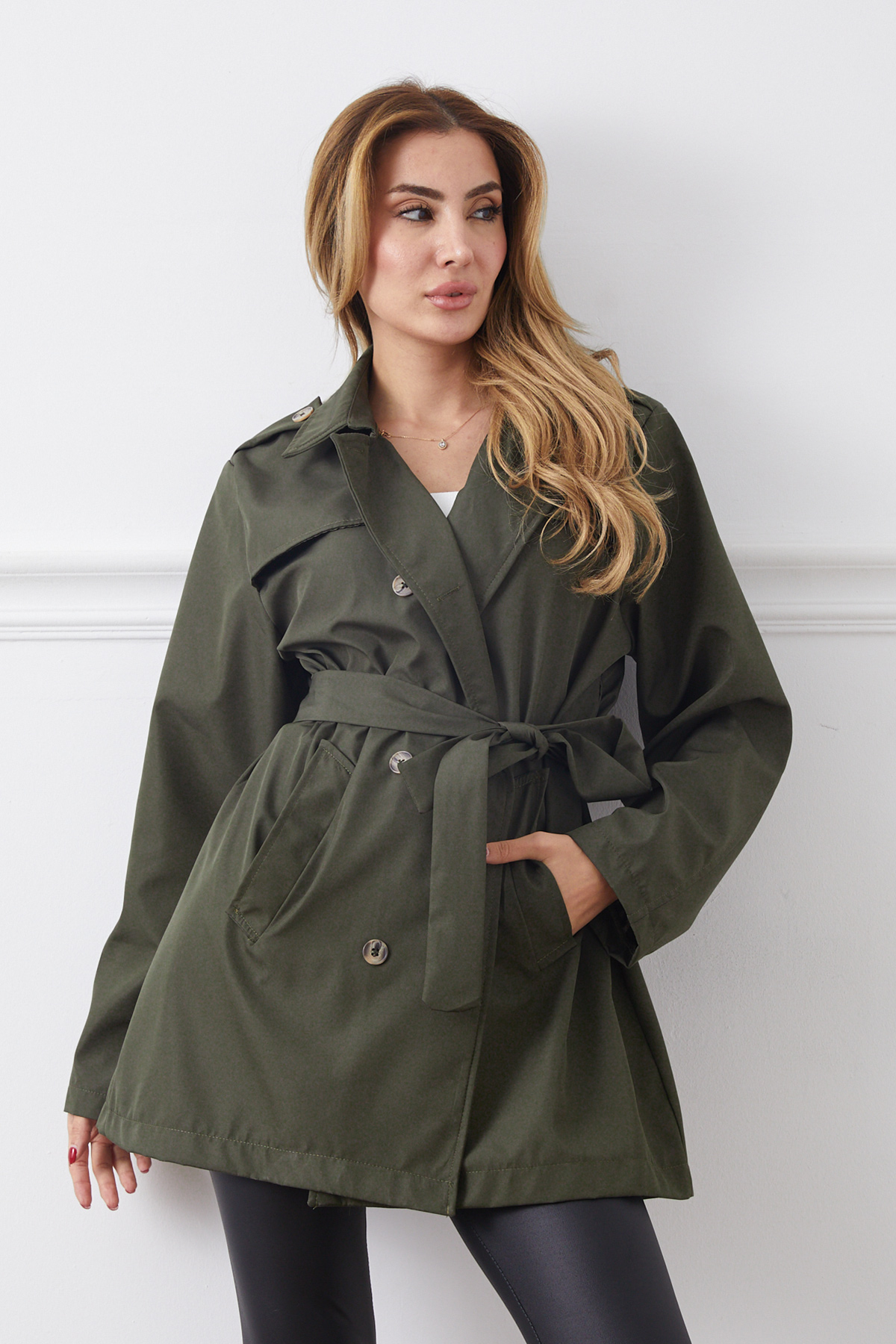 Büyük Beden Beli Kuşaklı Düğmeli Trençkot-Koyu Haki