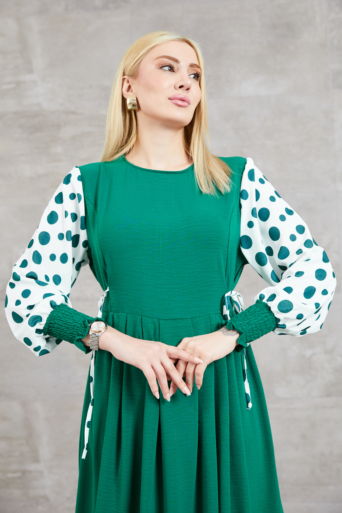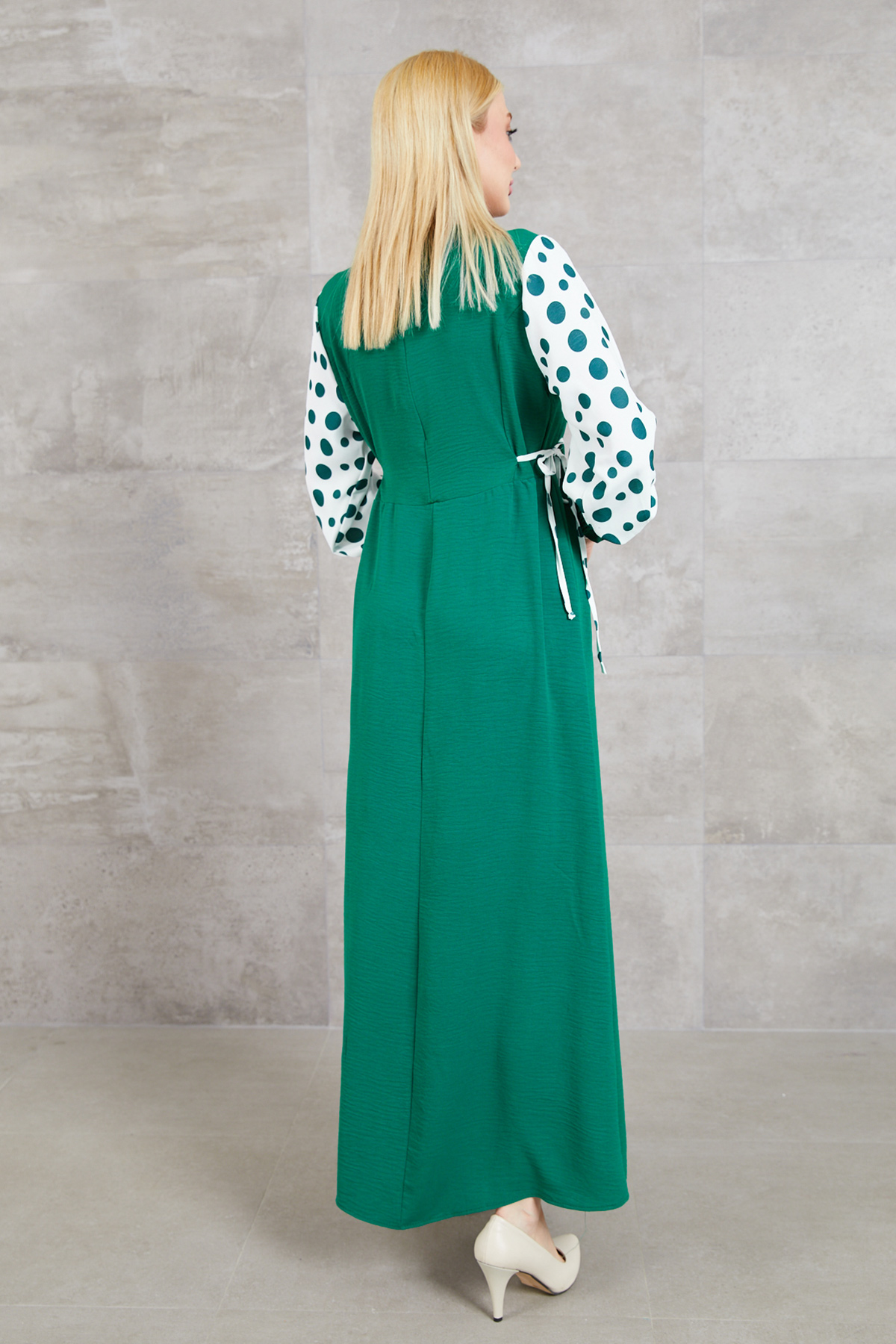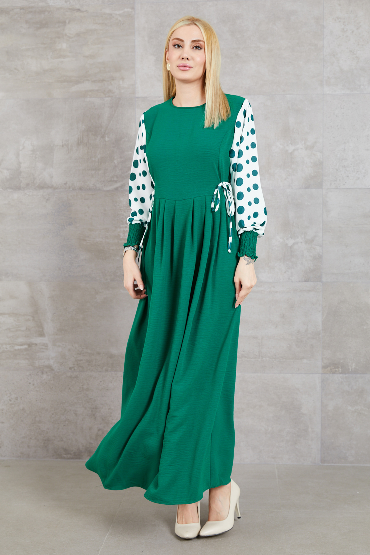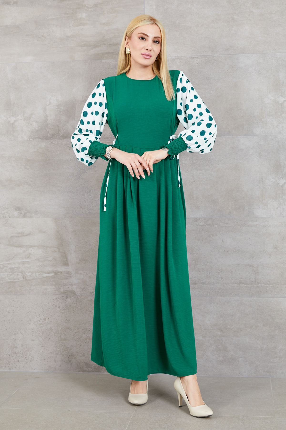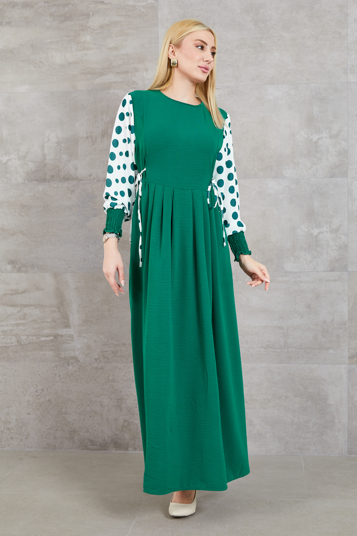 Büyük Beden Puantiyeli Kolu Lastikli Uzun Elbise-Koyu Yeşil