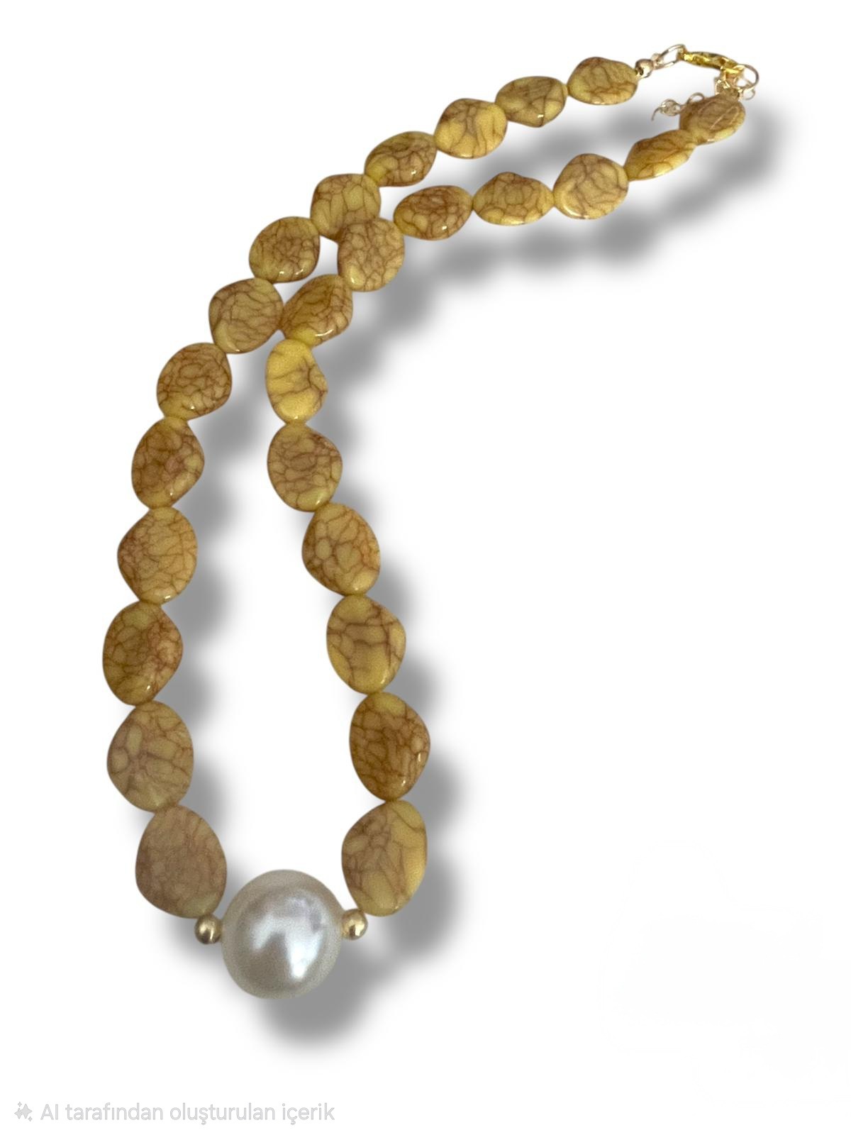 Büyük İnci Detaylı Doğal Taş Kolye -Hardal-Hardal