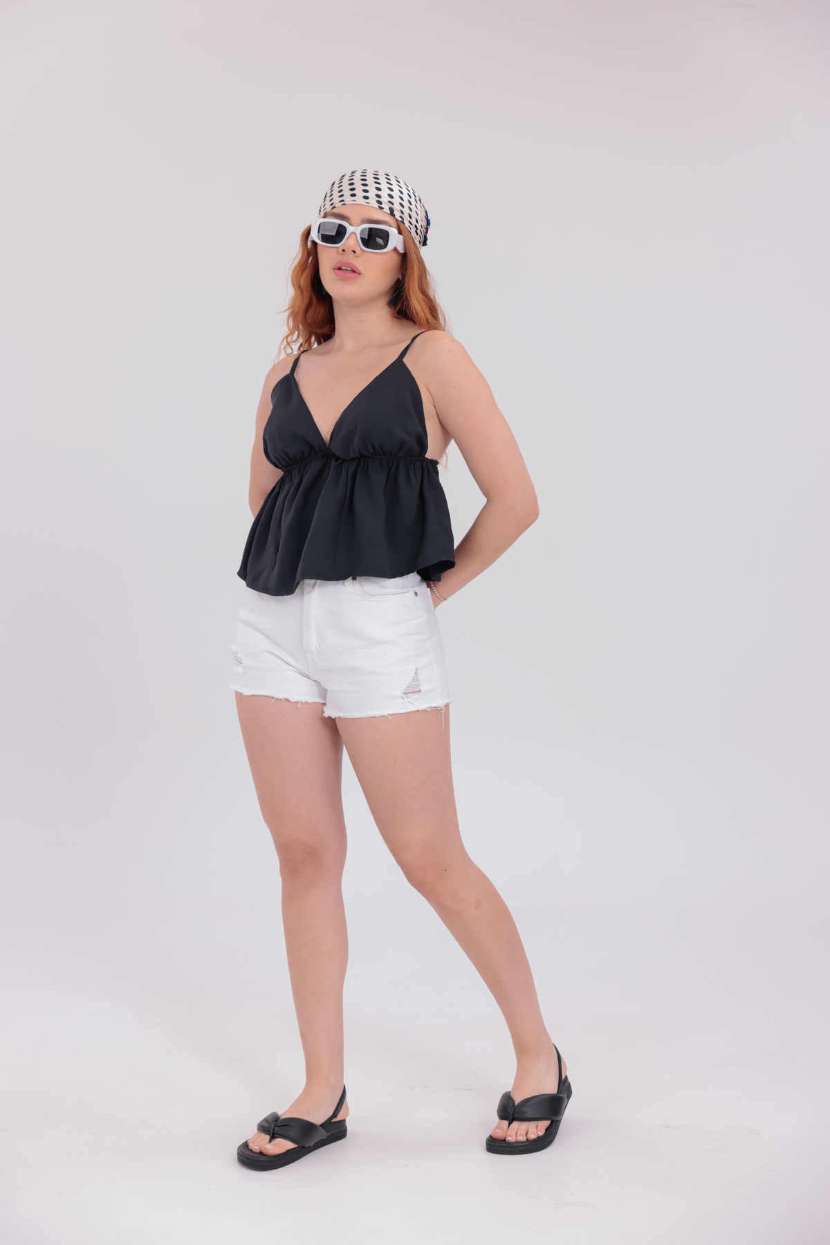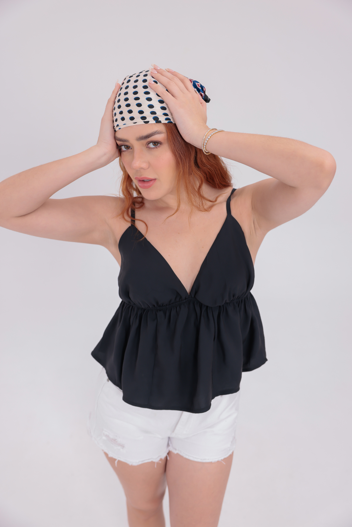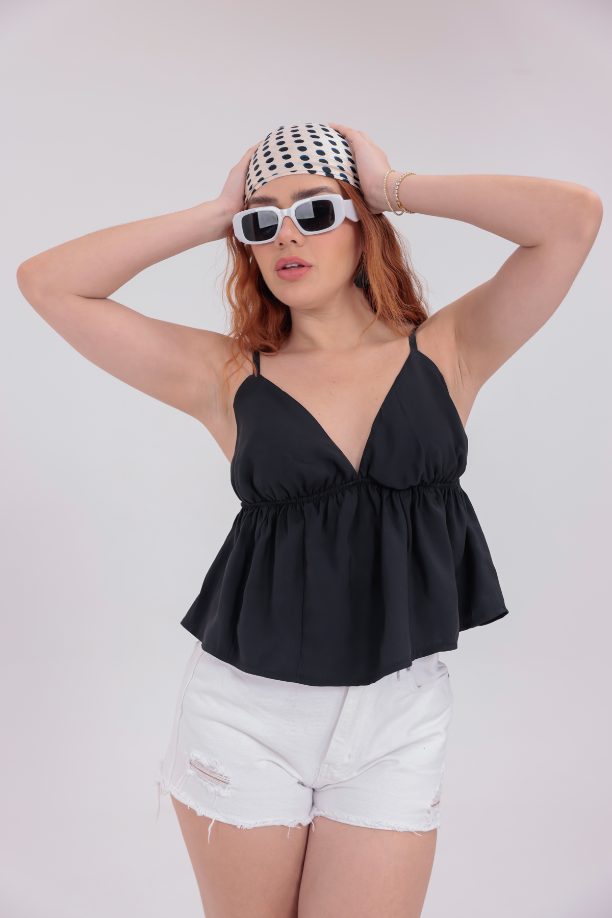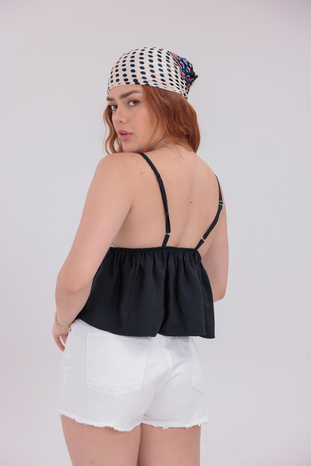 Büzgü Detaylı İp Askılı Dökümlü Bluz Siyah-Siyah