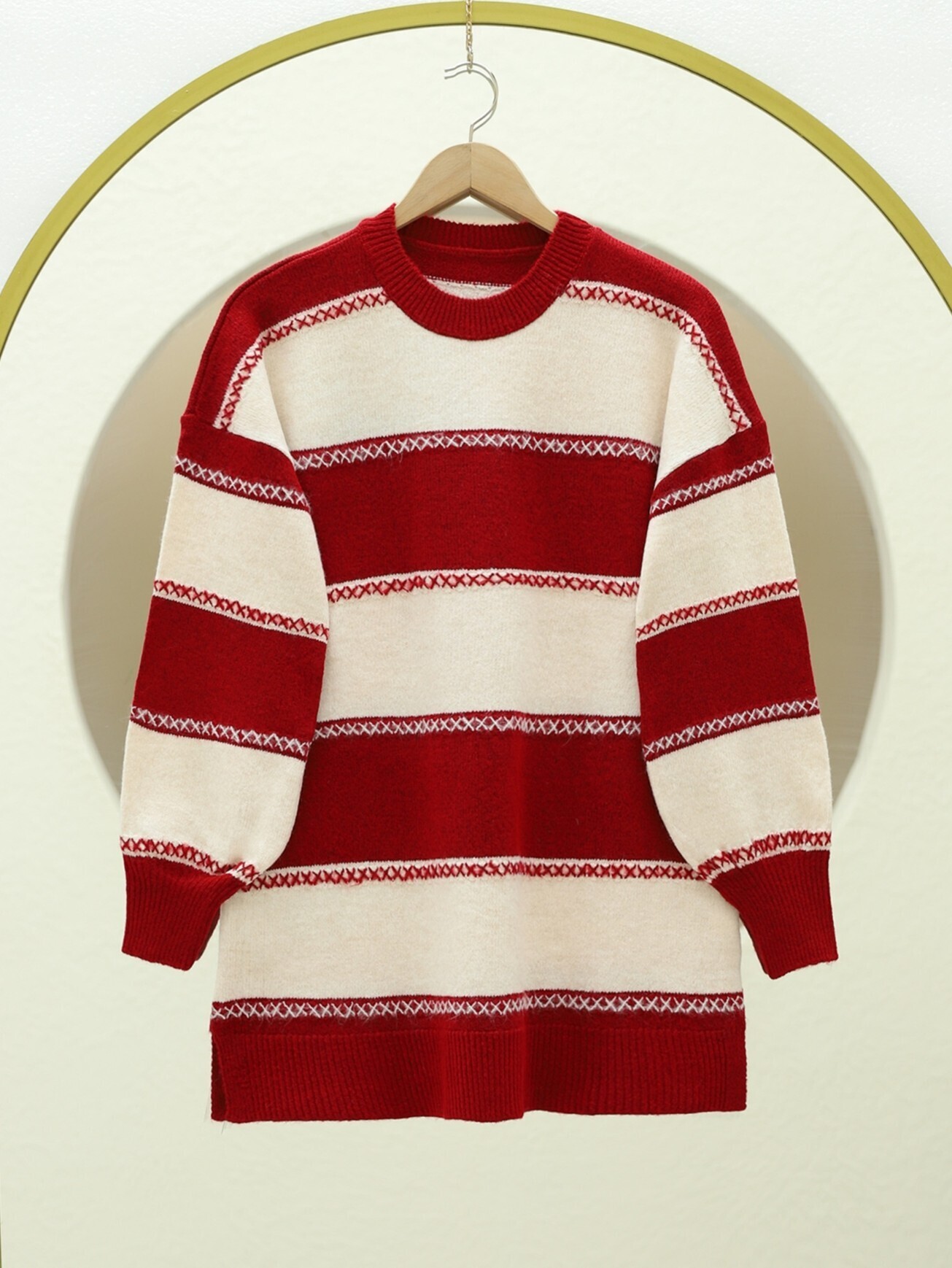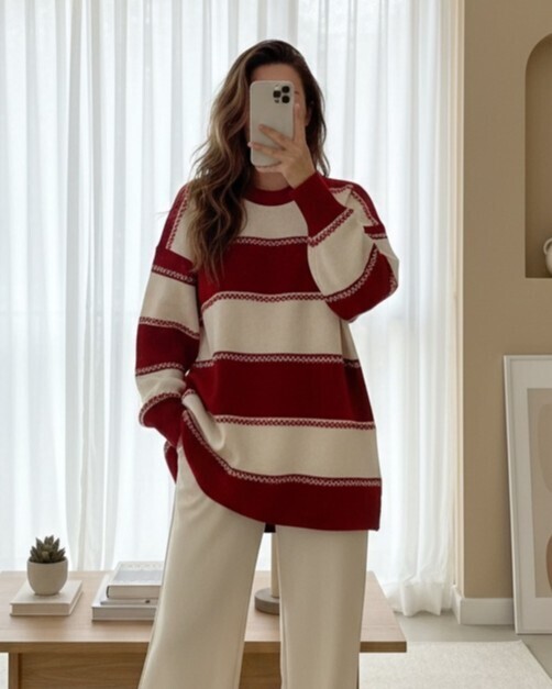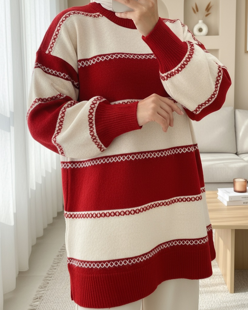 Çapraz Çizgi Desenli Triko Tunik -Kırmızı-Kırmızı
