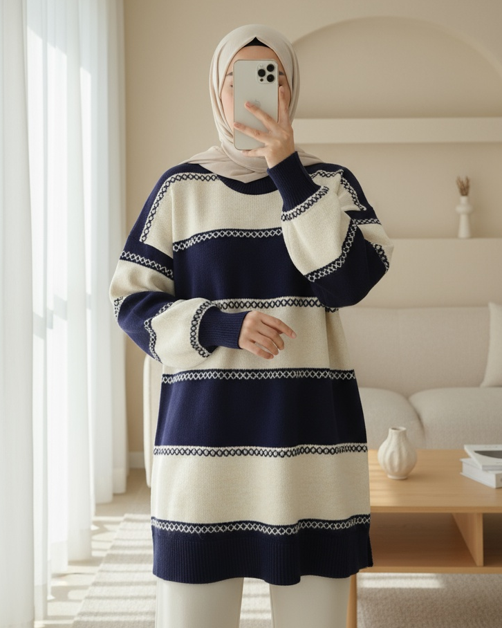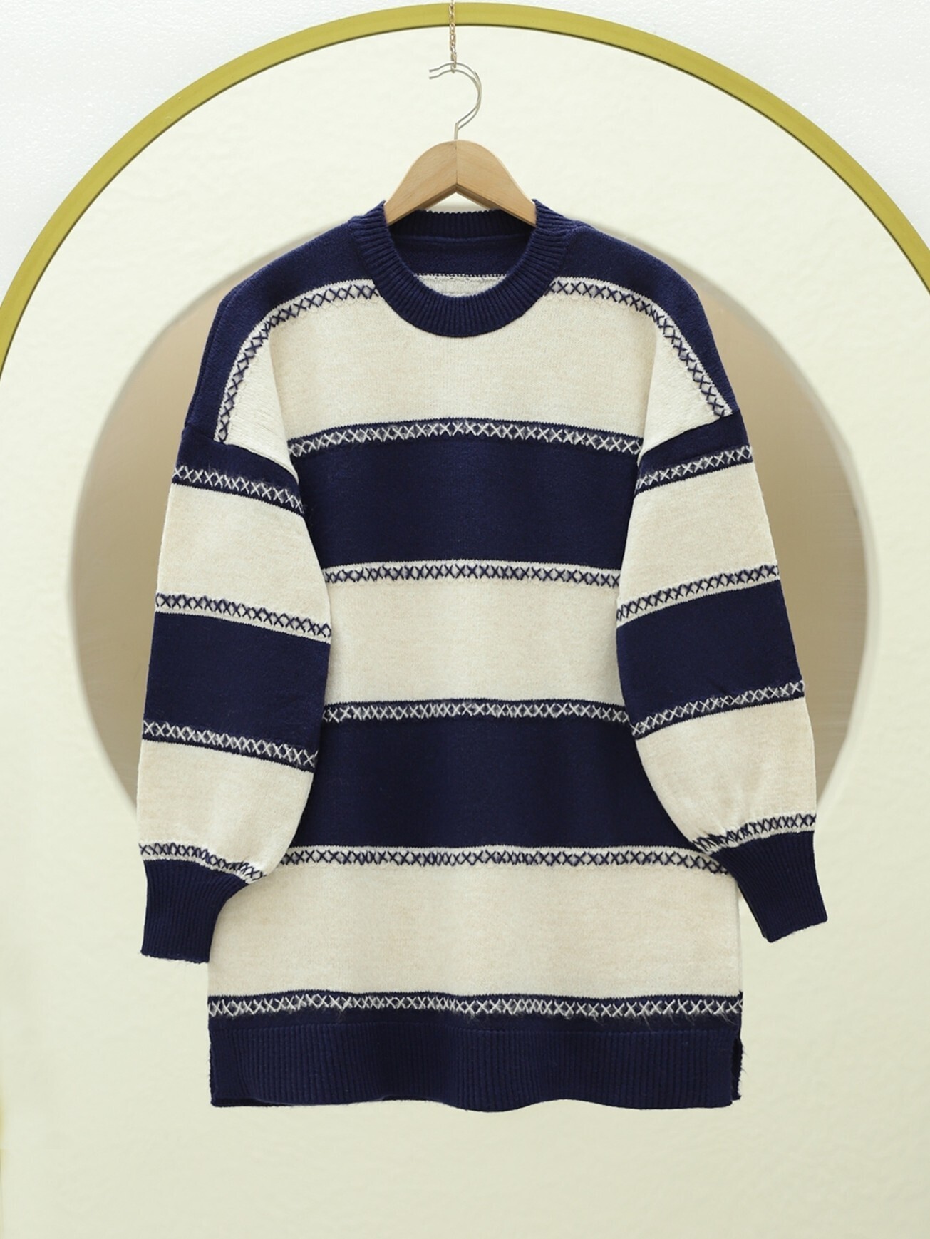Çapraz Çizgi Desenli Triko Tunik -Laci-Lacivert