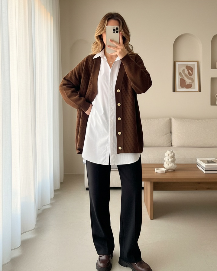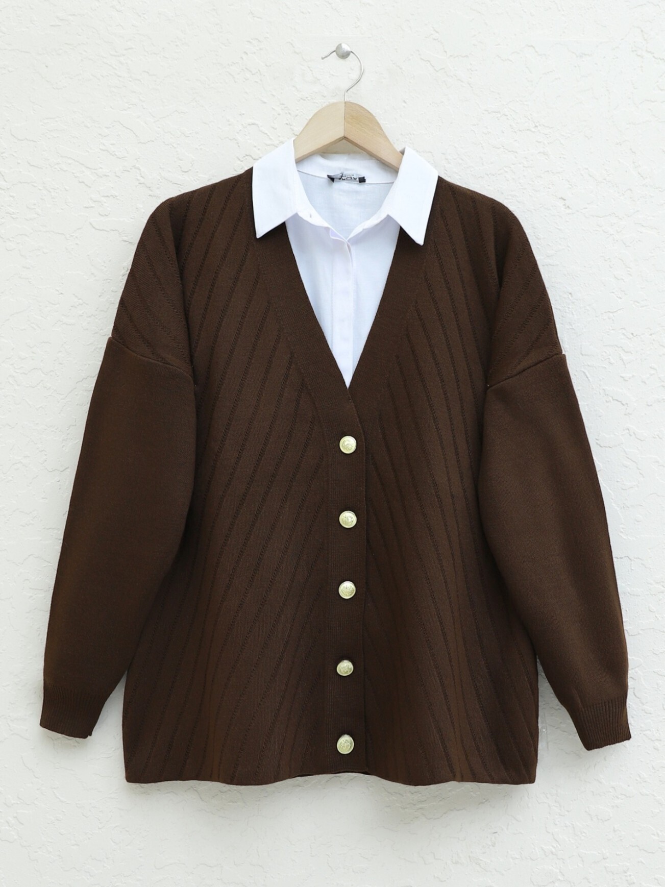 Çapraz Çizgili Broş Düğmeli Triko Hırka -Kahve-Kahve