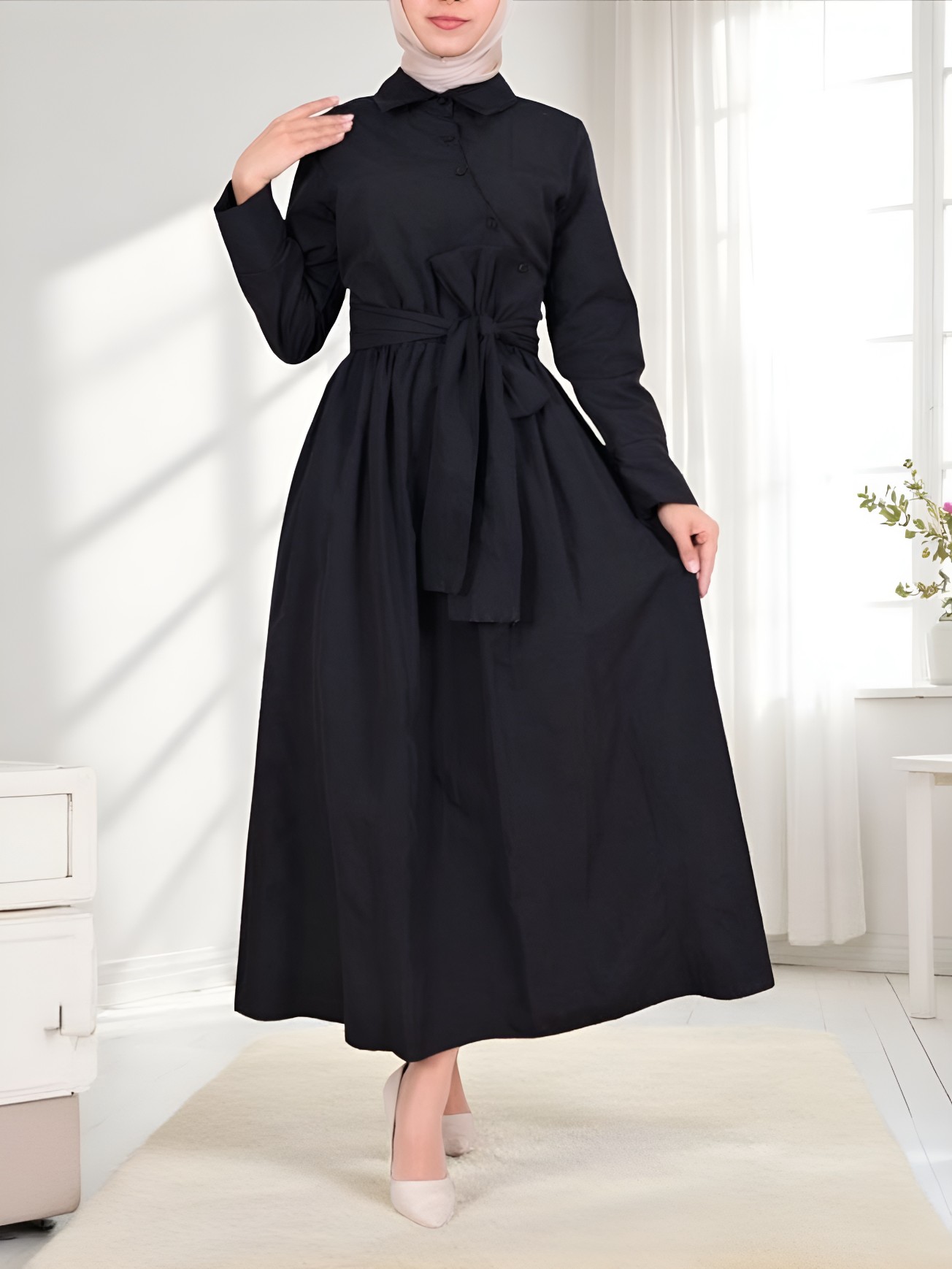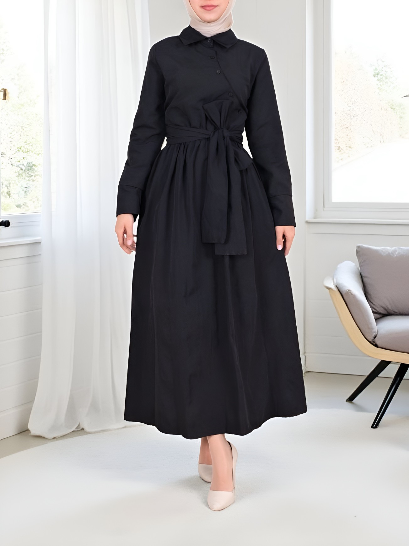 Çapraz Düğmeli Beli Bağlamalı Gömlek Yaka Elbise -Siyah-siyah