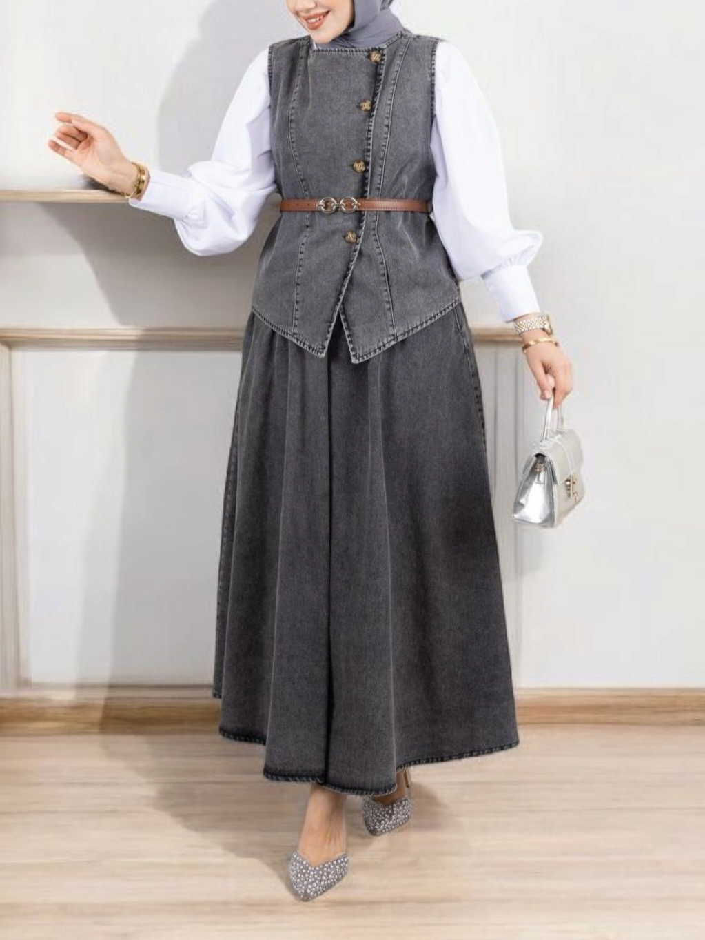 Çapraz Düğmeli Kemerli Yelek Etek Kot Takım -Füme-Füme