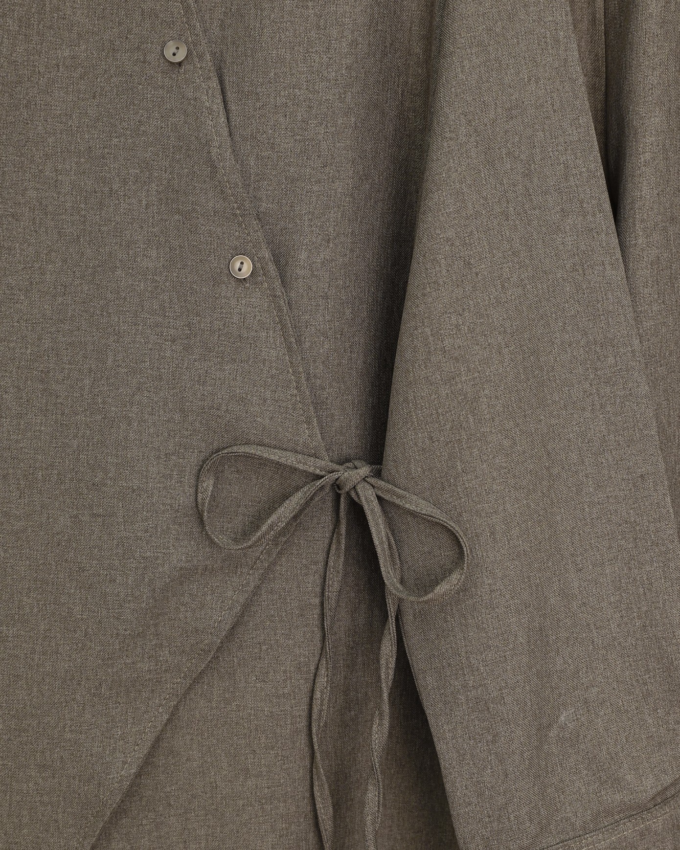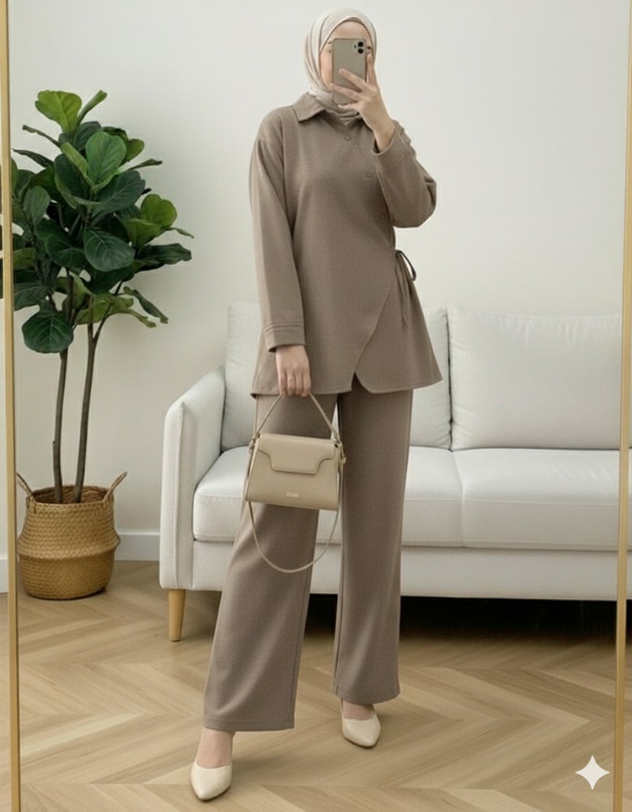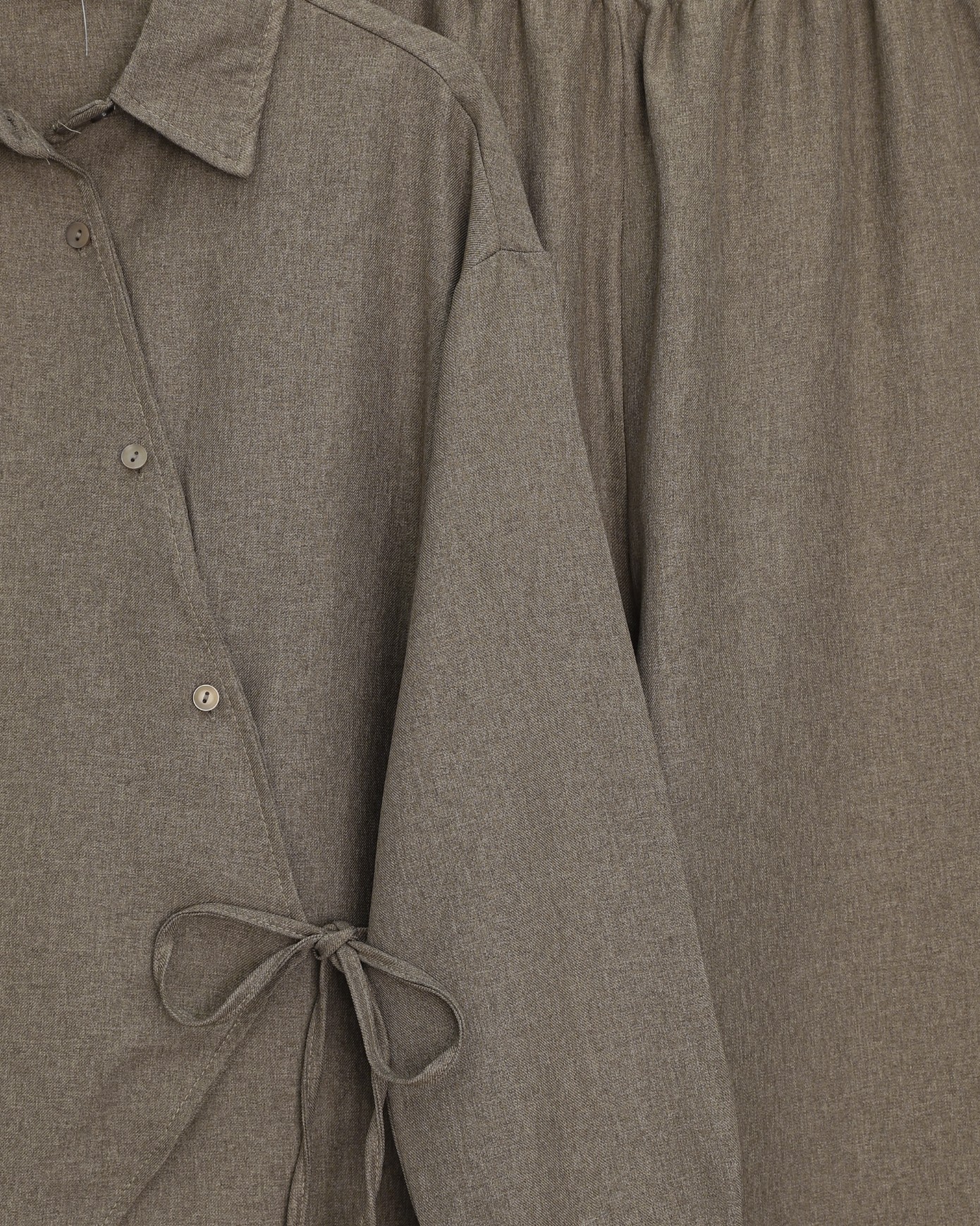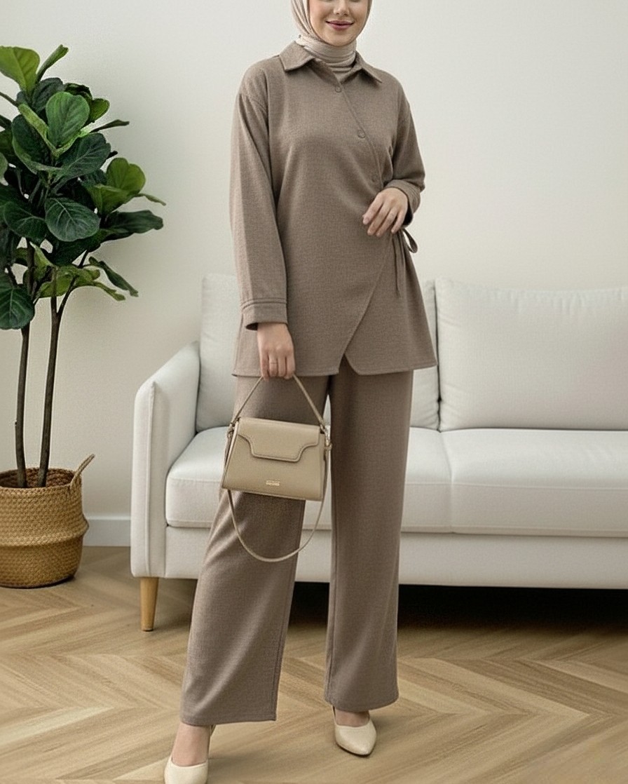 Çapraz Düğmeli Yandan Bağlamalı Yün Efekt Takım -Açık Kahve-Açık Kahve