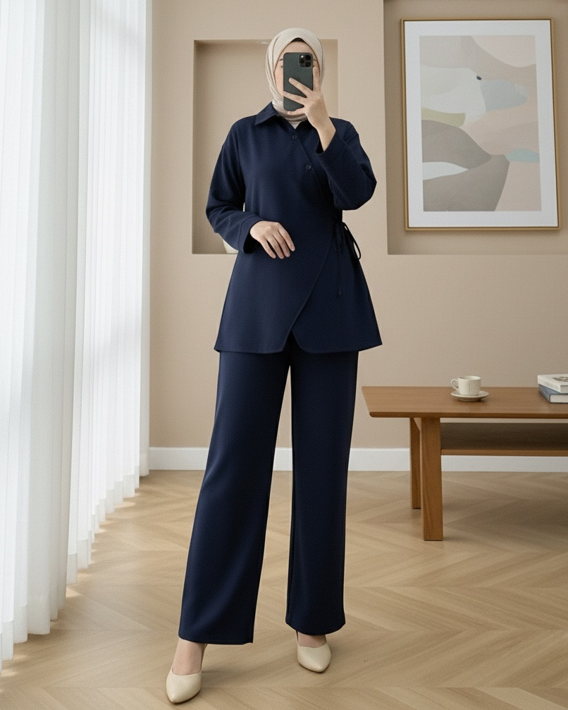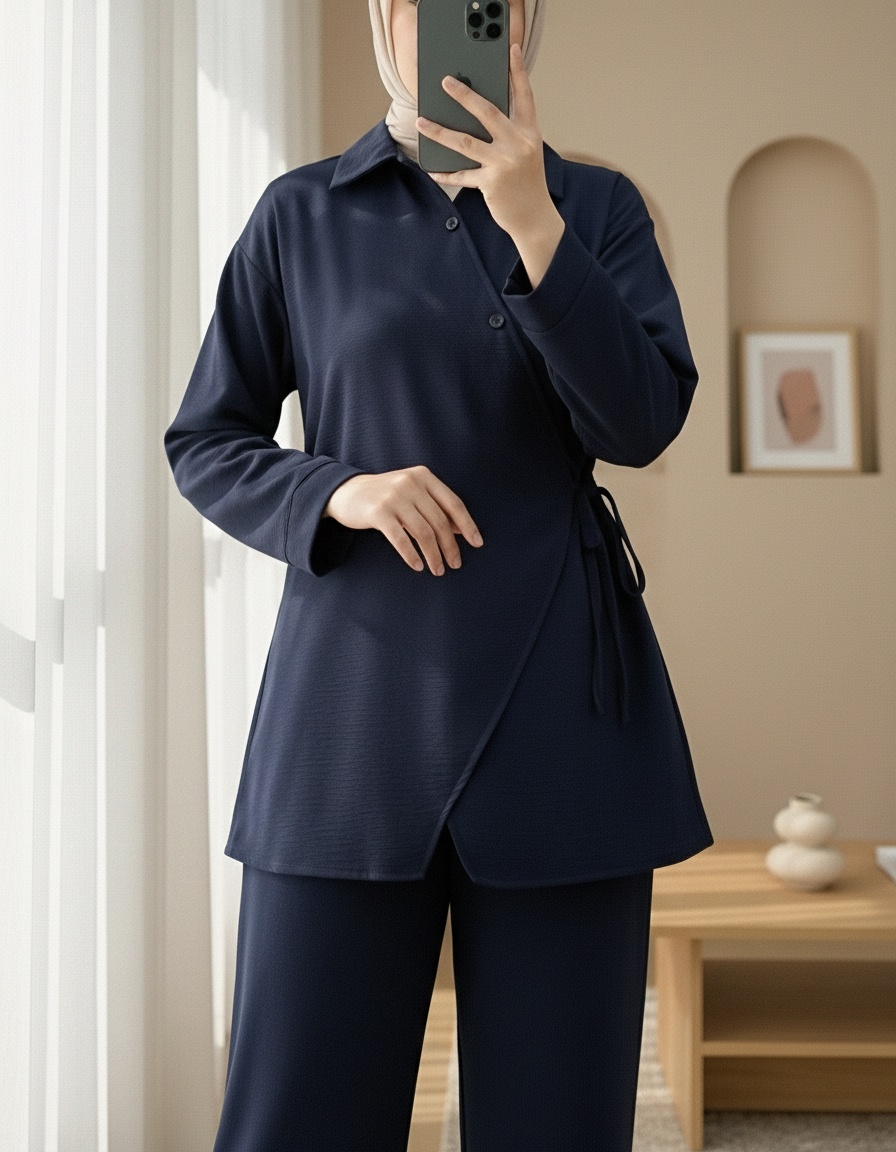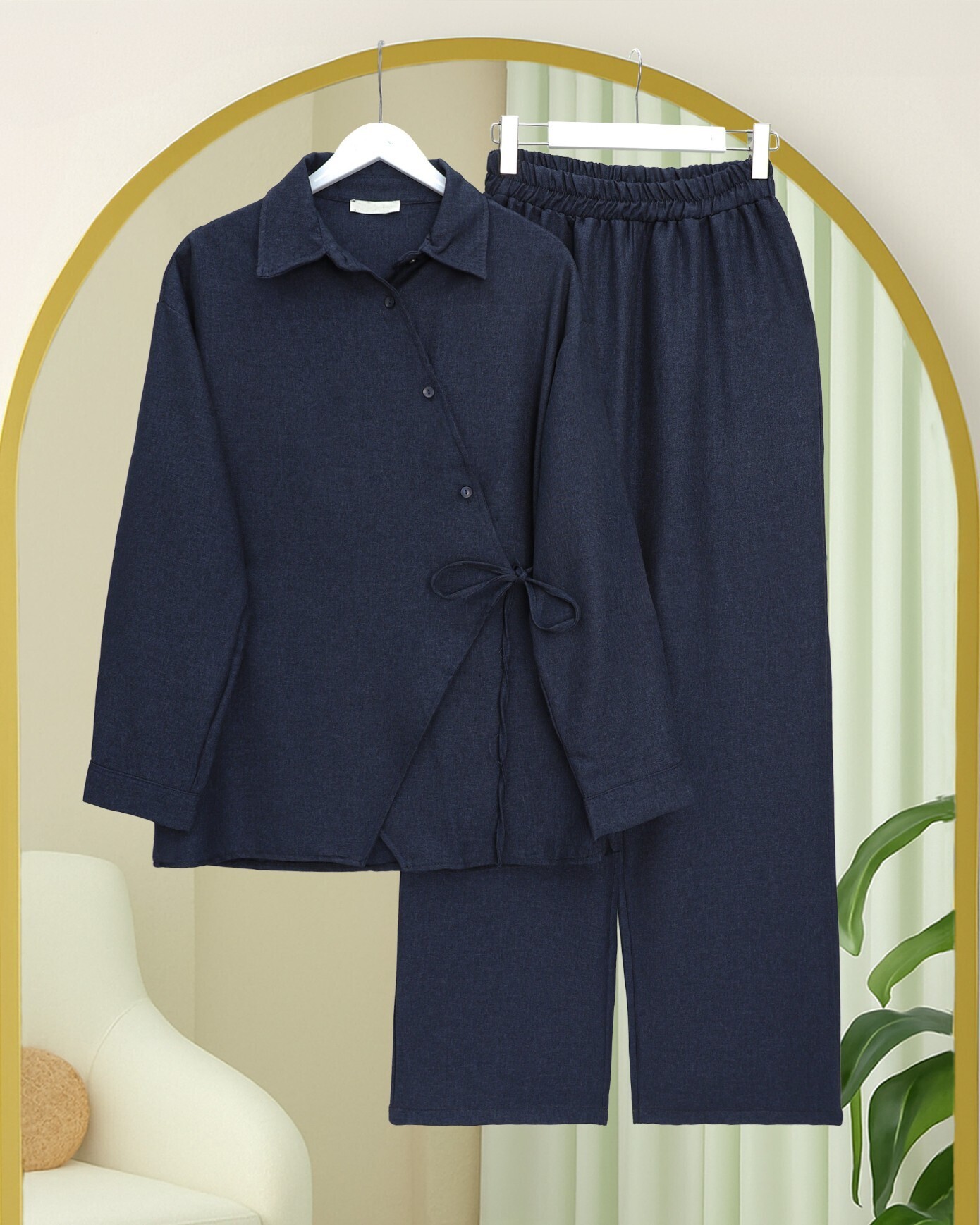 Çapraz Düğmeli Yandan Bağlamalı Yün Efekt Takım -Laci-Lacivert