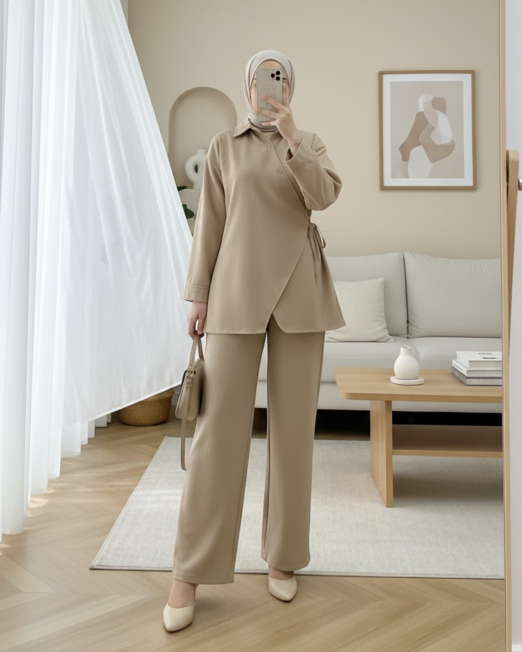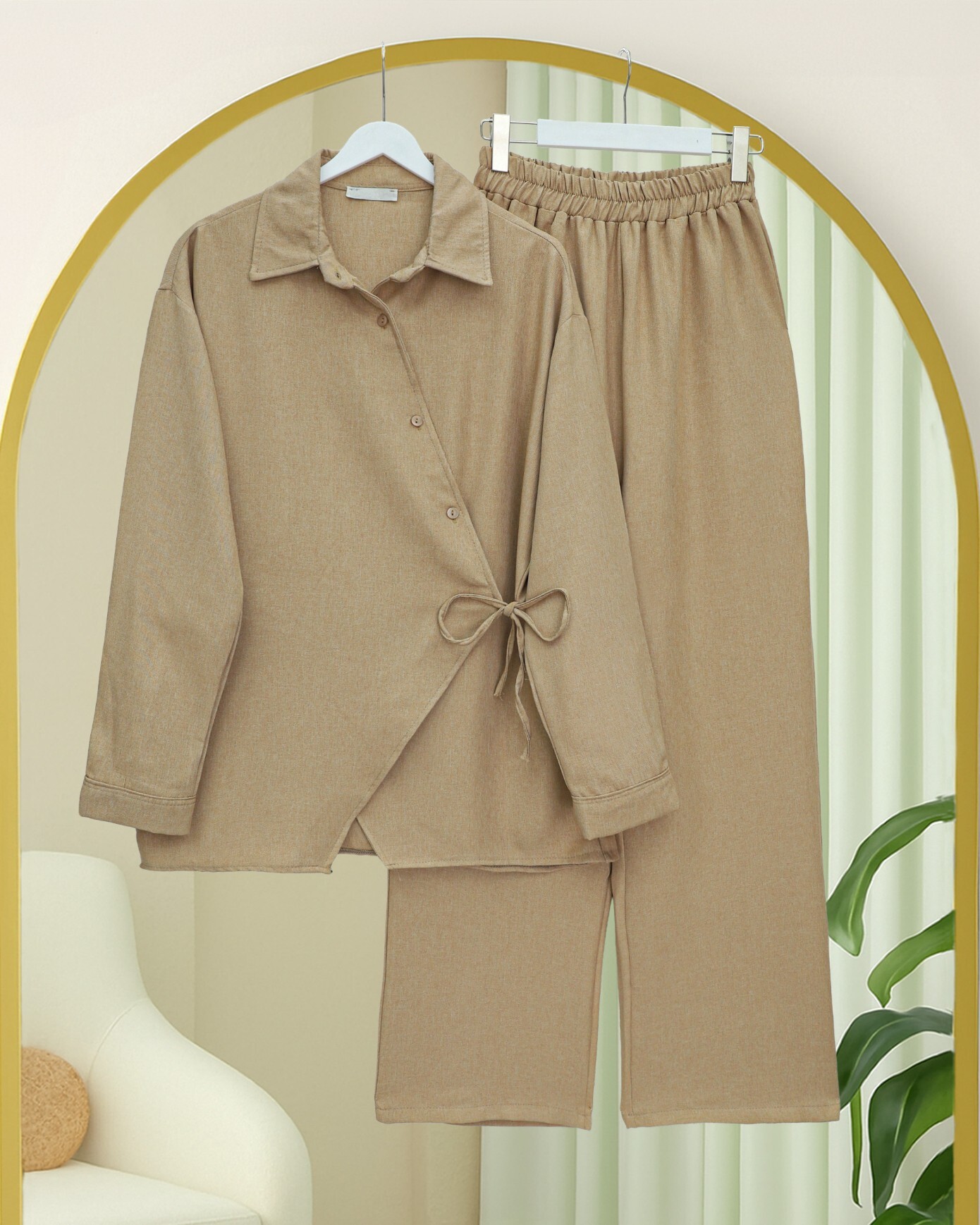 Çapraz Düğmeli Yandan Bağlamalı Yün Efekt Takım -Vizon-Vizon