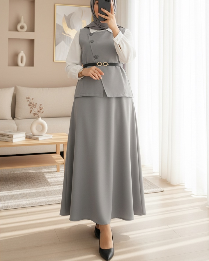 Çapraz Düğmeli Yelek Etek İkili Takım -Gri-Gri