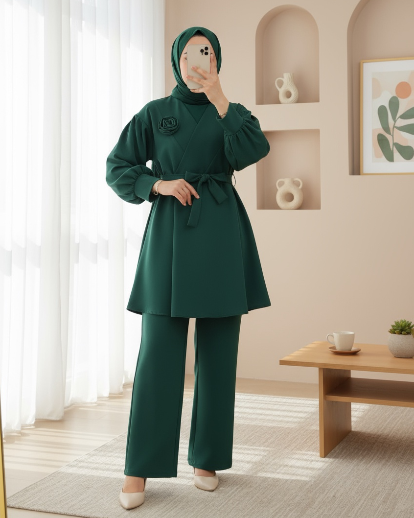 Çapraz Yaka Gül Detaylı Kemerli İkili Takım -Zümrüt-Zümrüt
