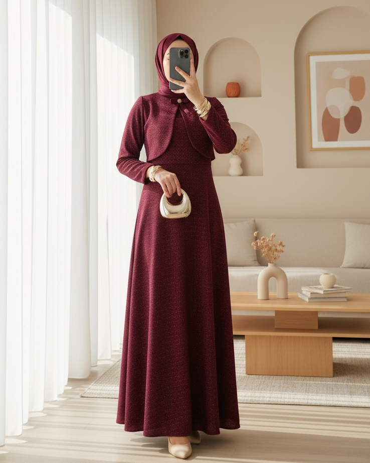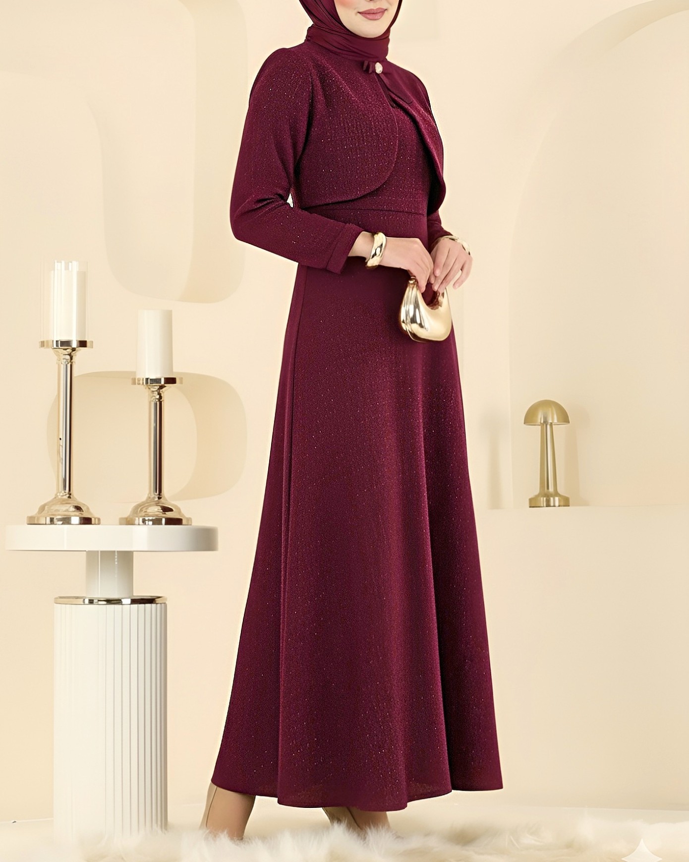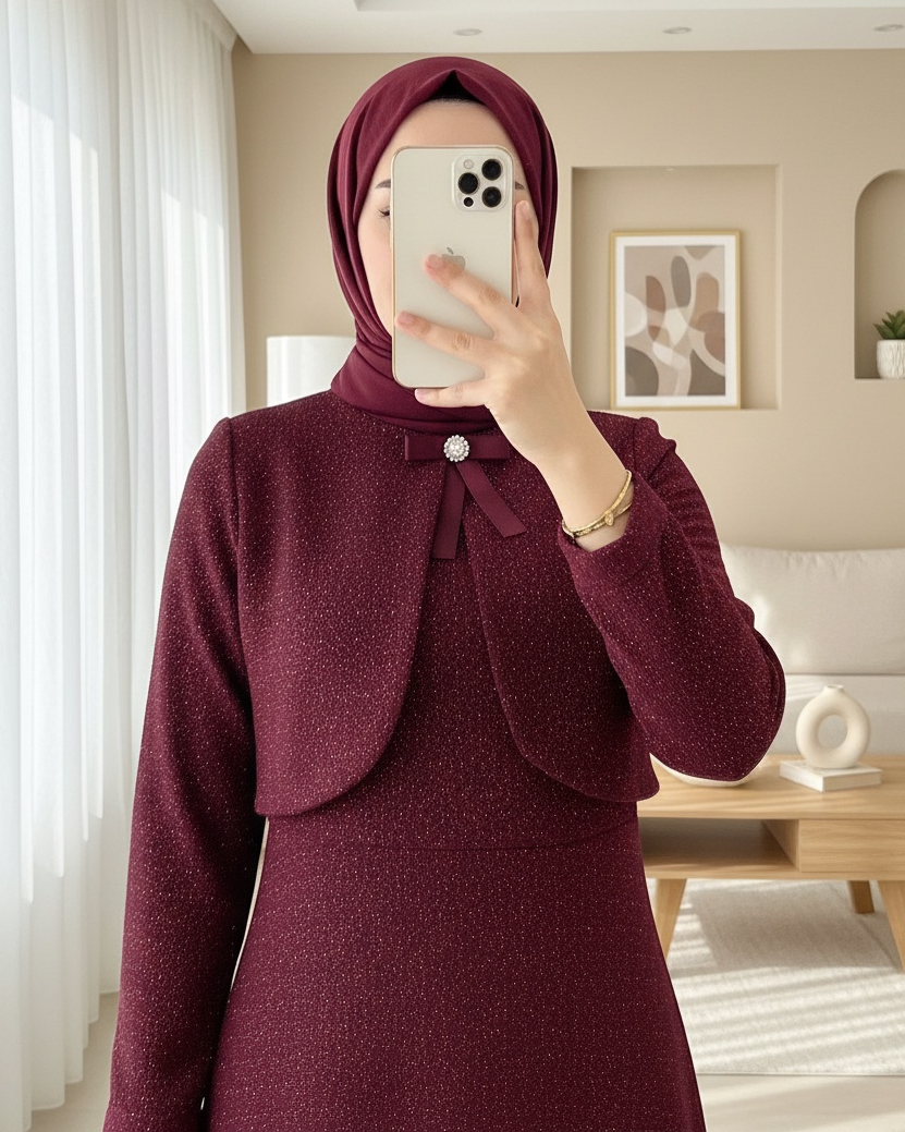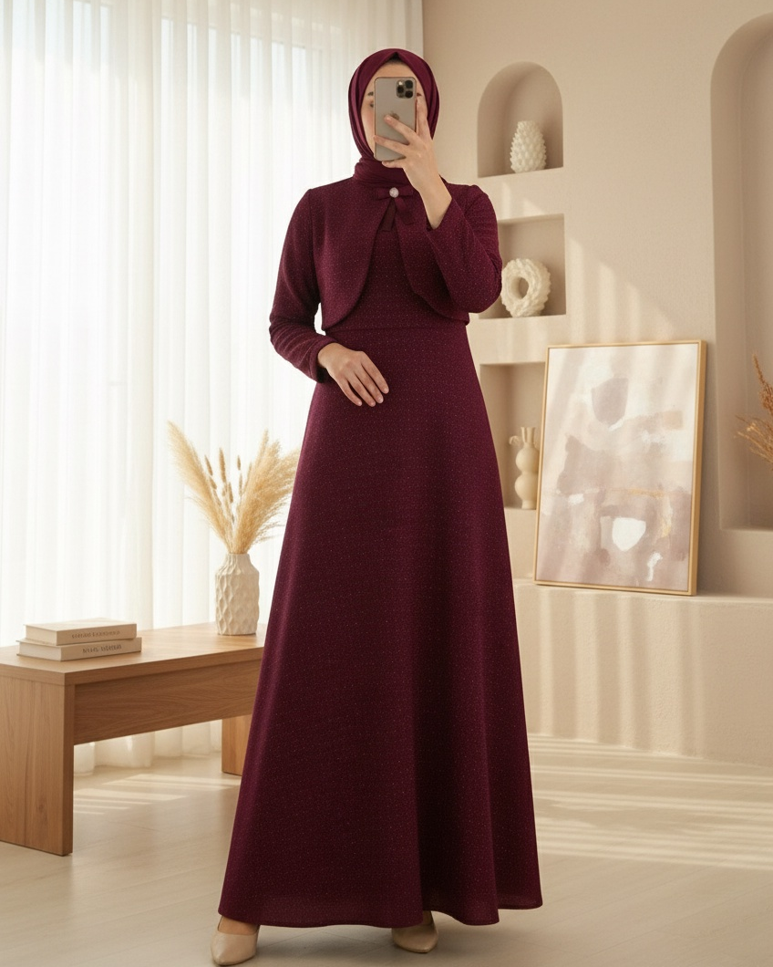 Ceket Detaylı Simli Broşlu Elbise -Bordo-Bordo