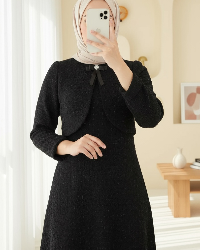 Ceket Detaylı Simli Broşlu Elbise -Siyah-siyah