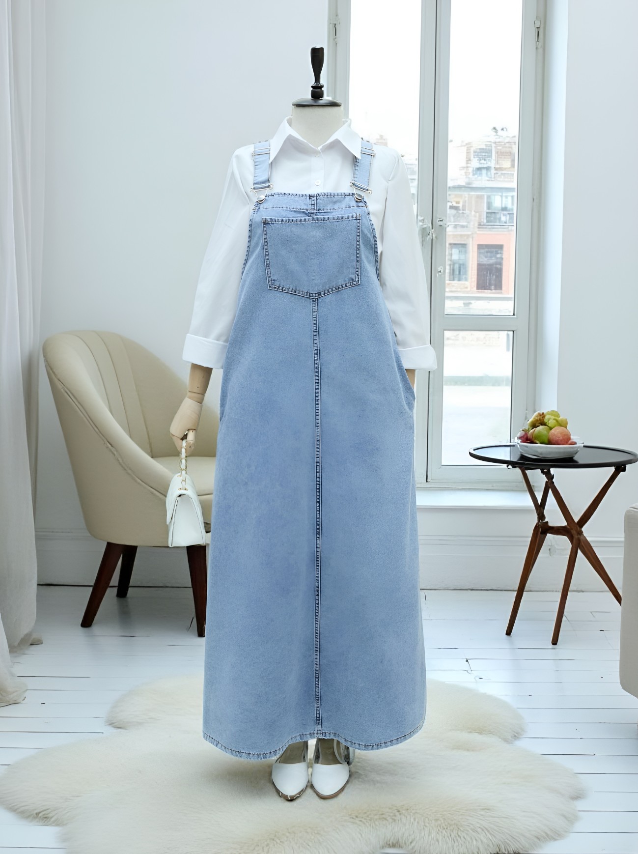 Cep Detaylı Askılı Kot Salopet -Buz Mavi-Buz Mavi