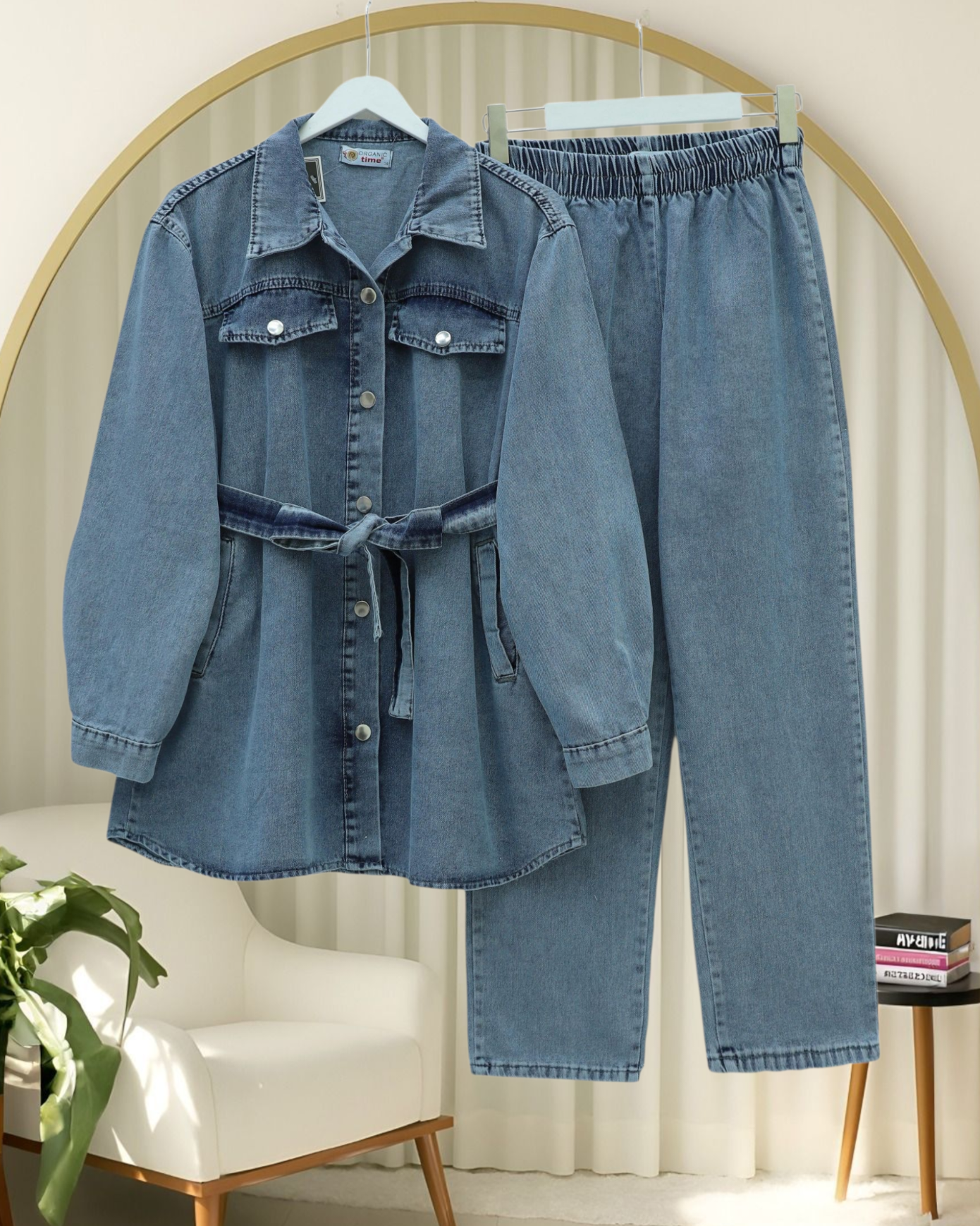 Cepli Beli Kemerli Düğmeli Kot Takım -Buz Mavi-Buz Mavi