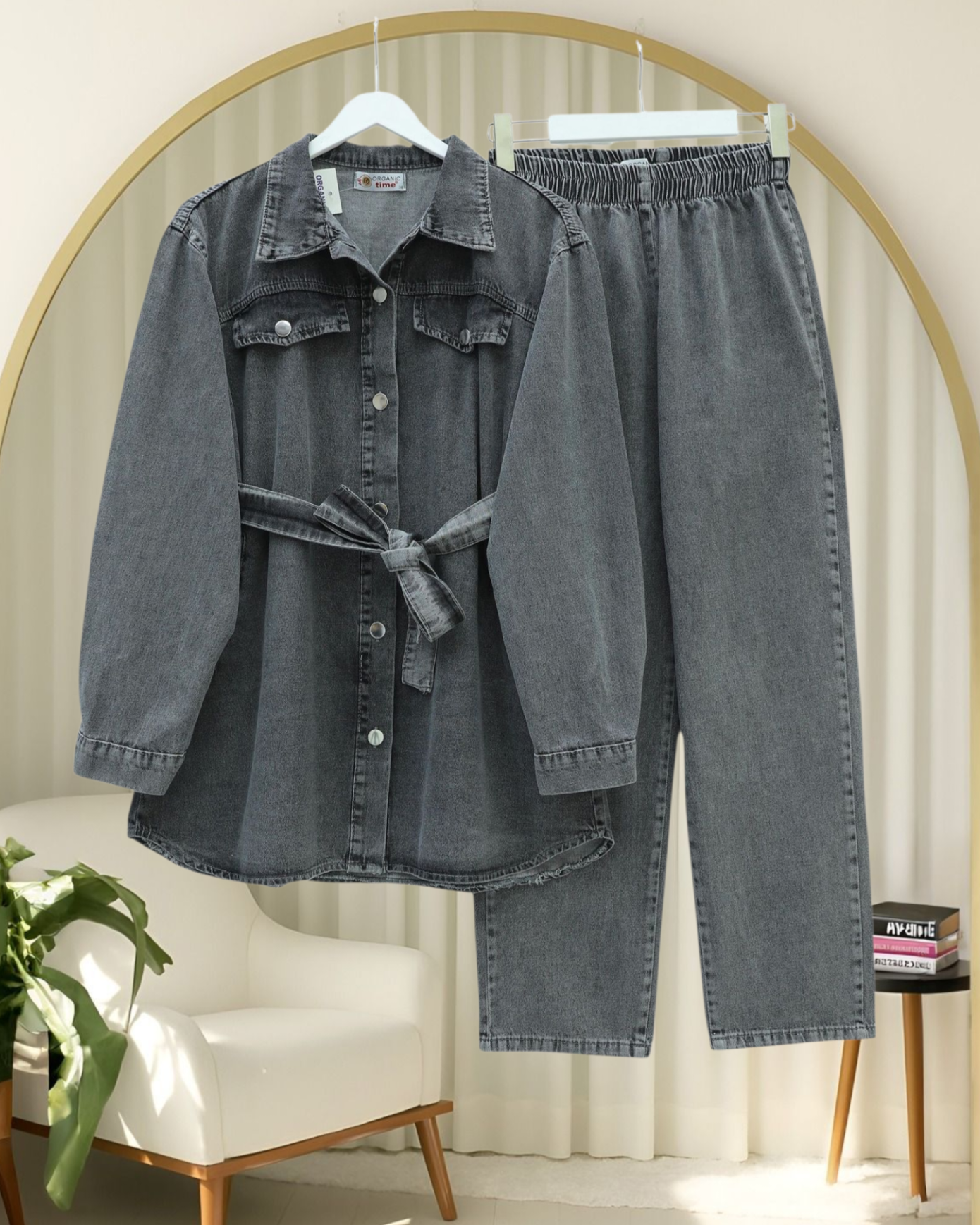Cepli Beli Kemerli Düğmeli Kot Takım -Füme-Füme