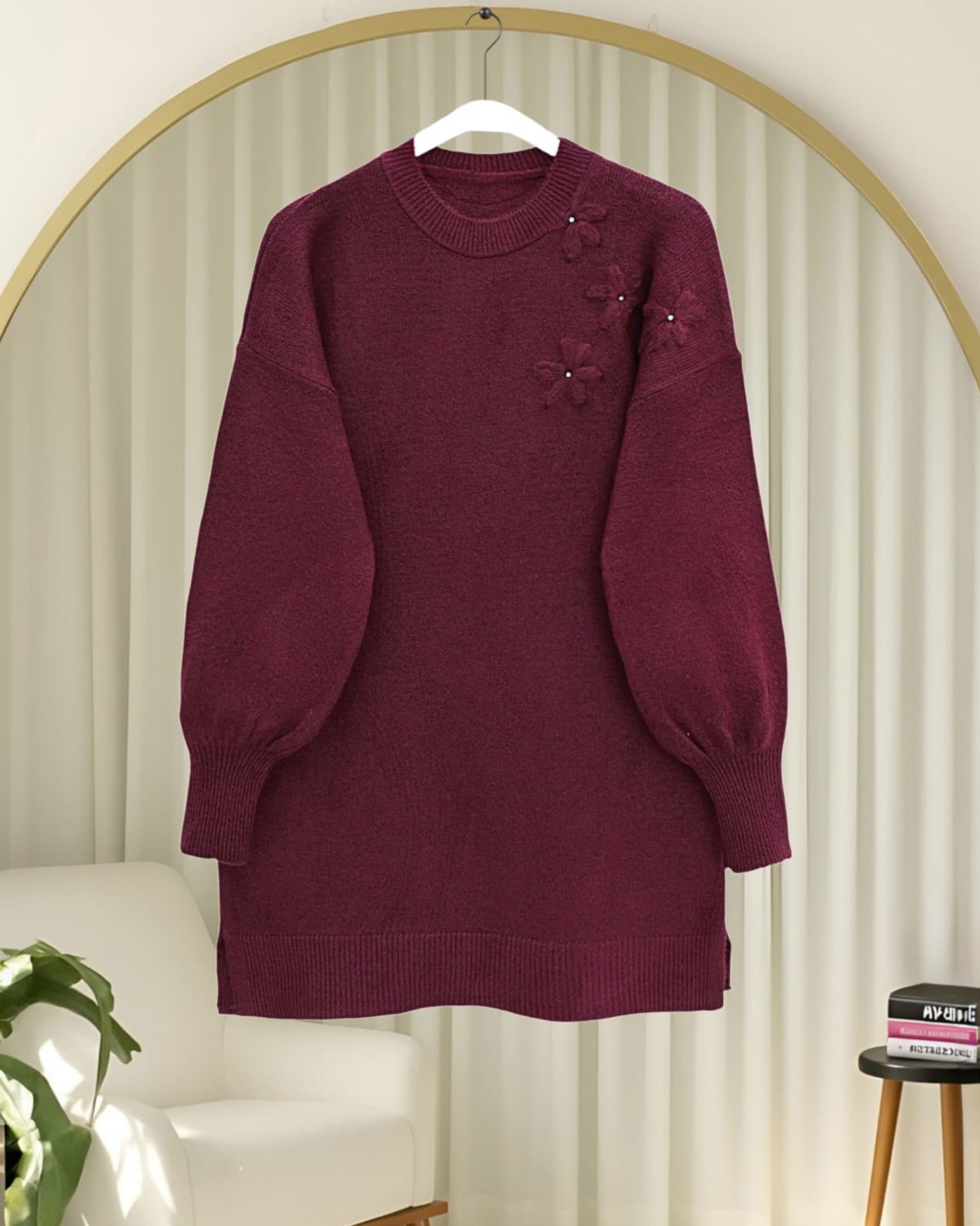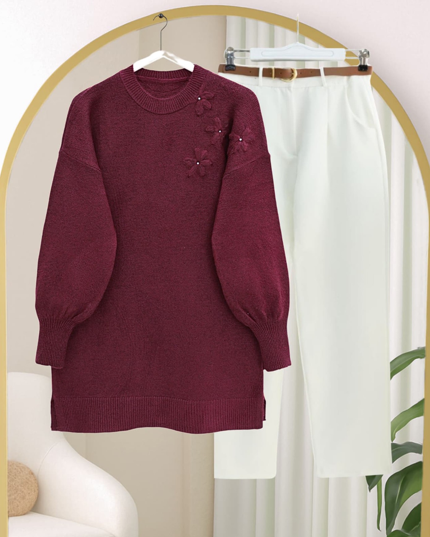 Çiçek Desenli Taşlı Yumoş Triko Kazak -Bordo-Bordo