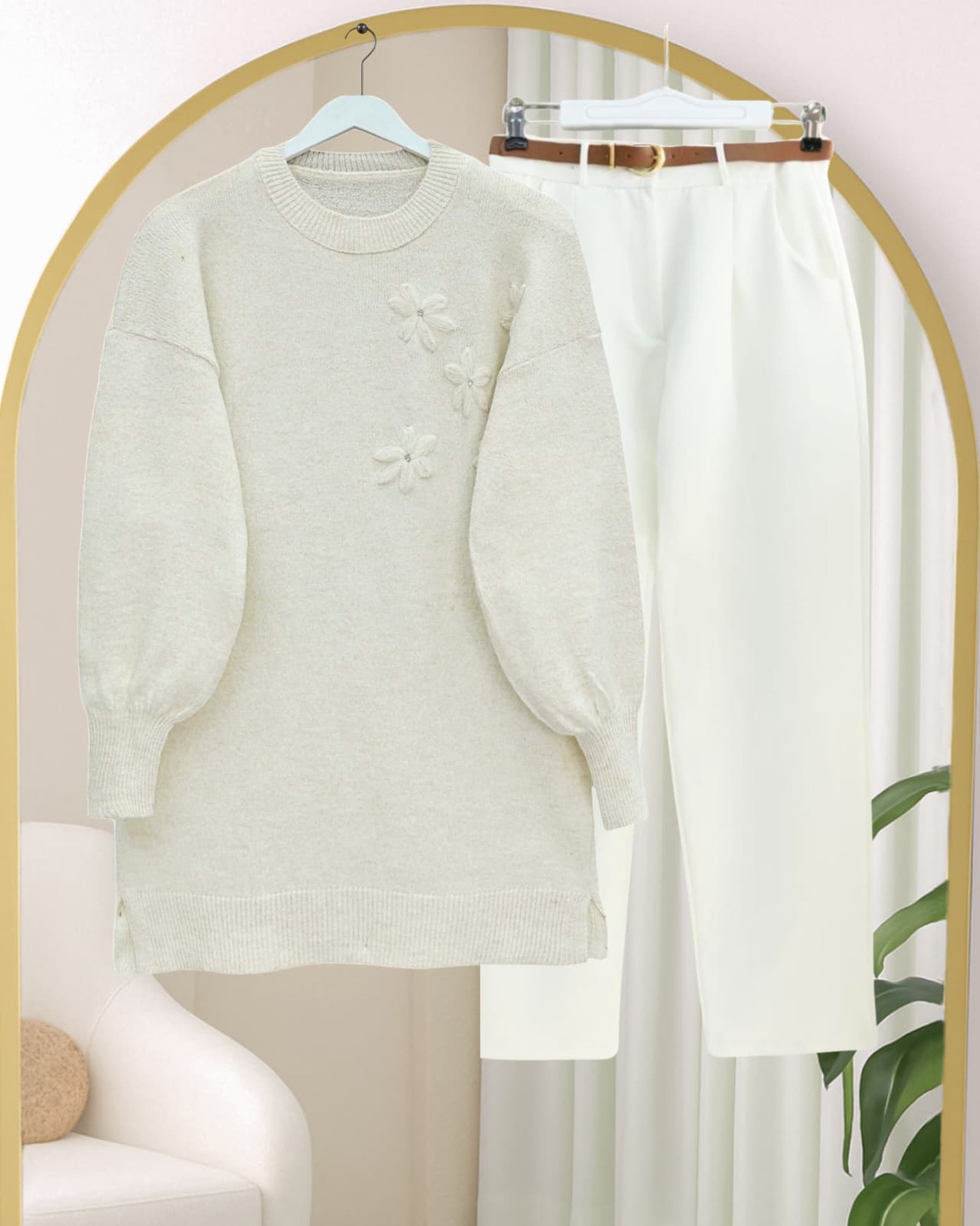 Çiçek Desenli Taşlı Yumoş Triko Kazak -Ekru-Ekru