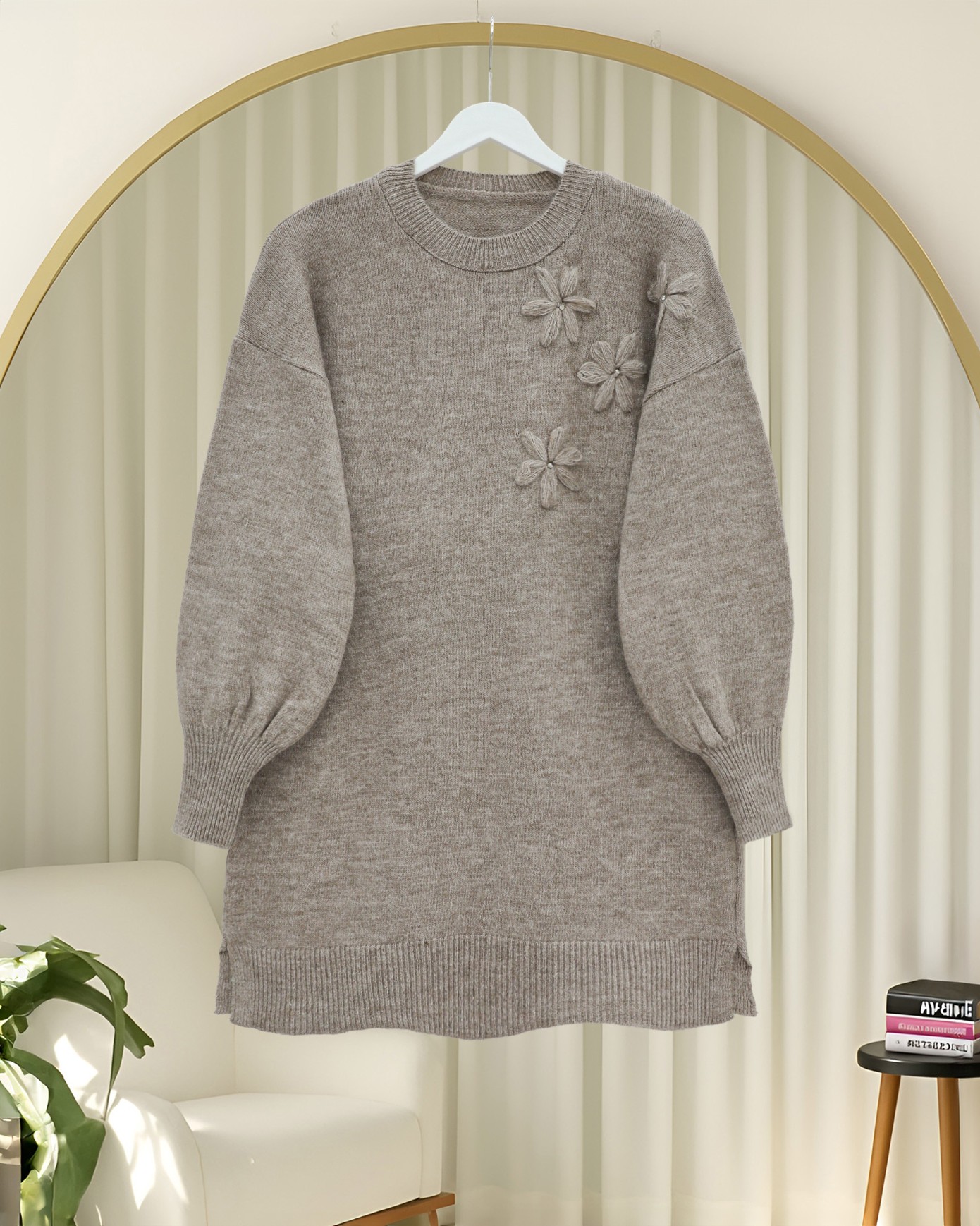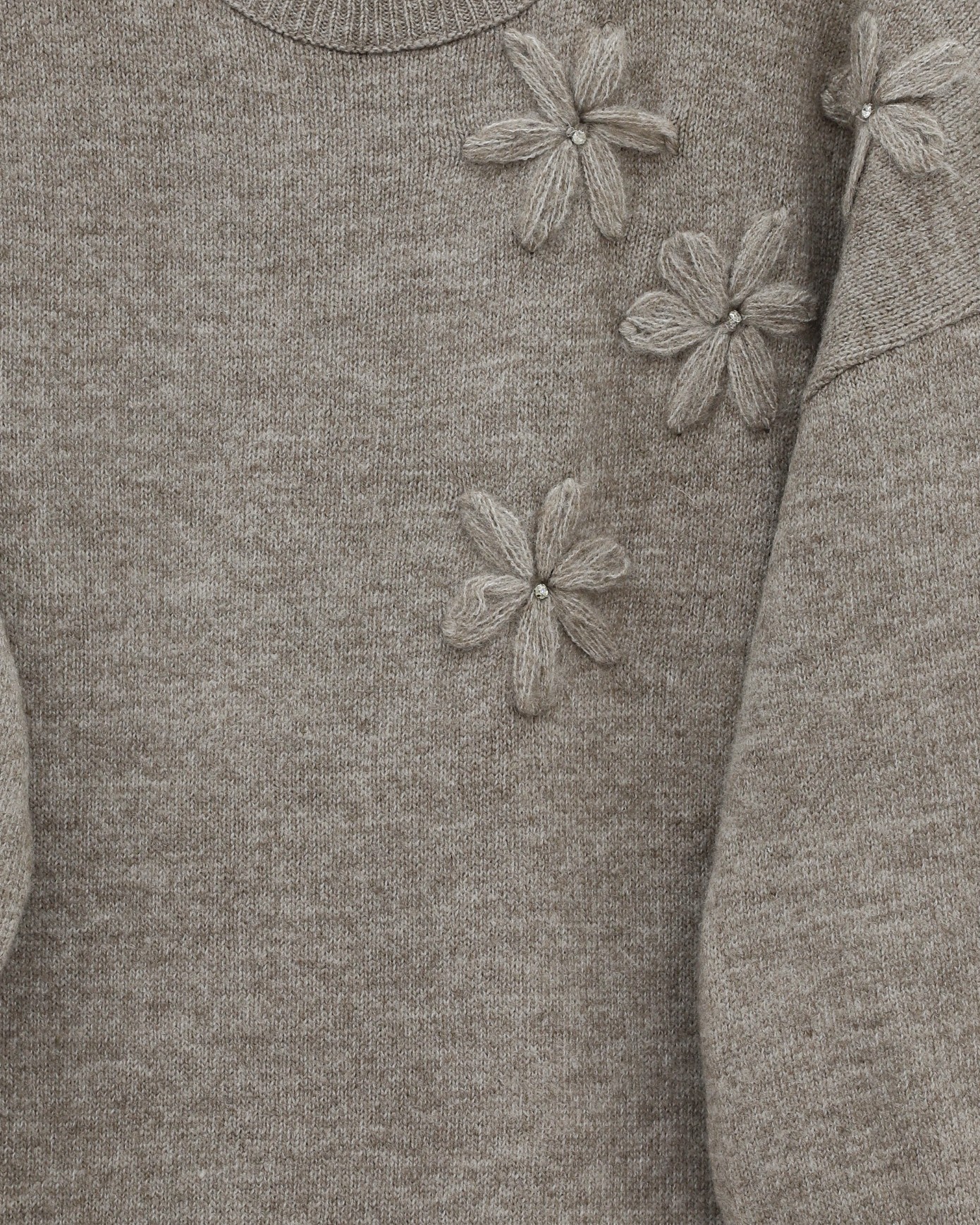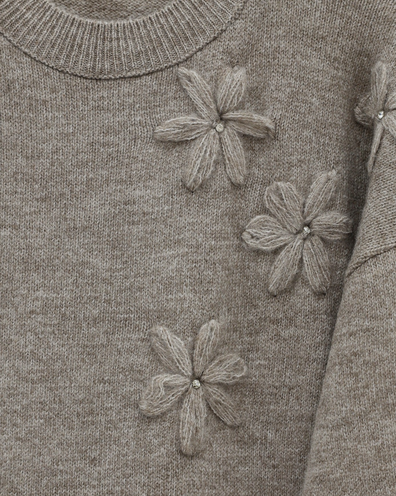 Çiçek Desenli Taşlı Yumoş Triko Kazak -Toprak-Toprak