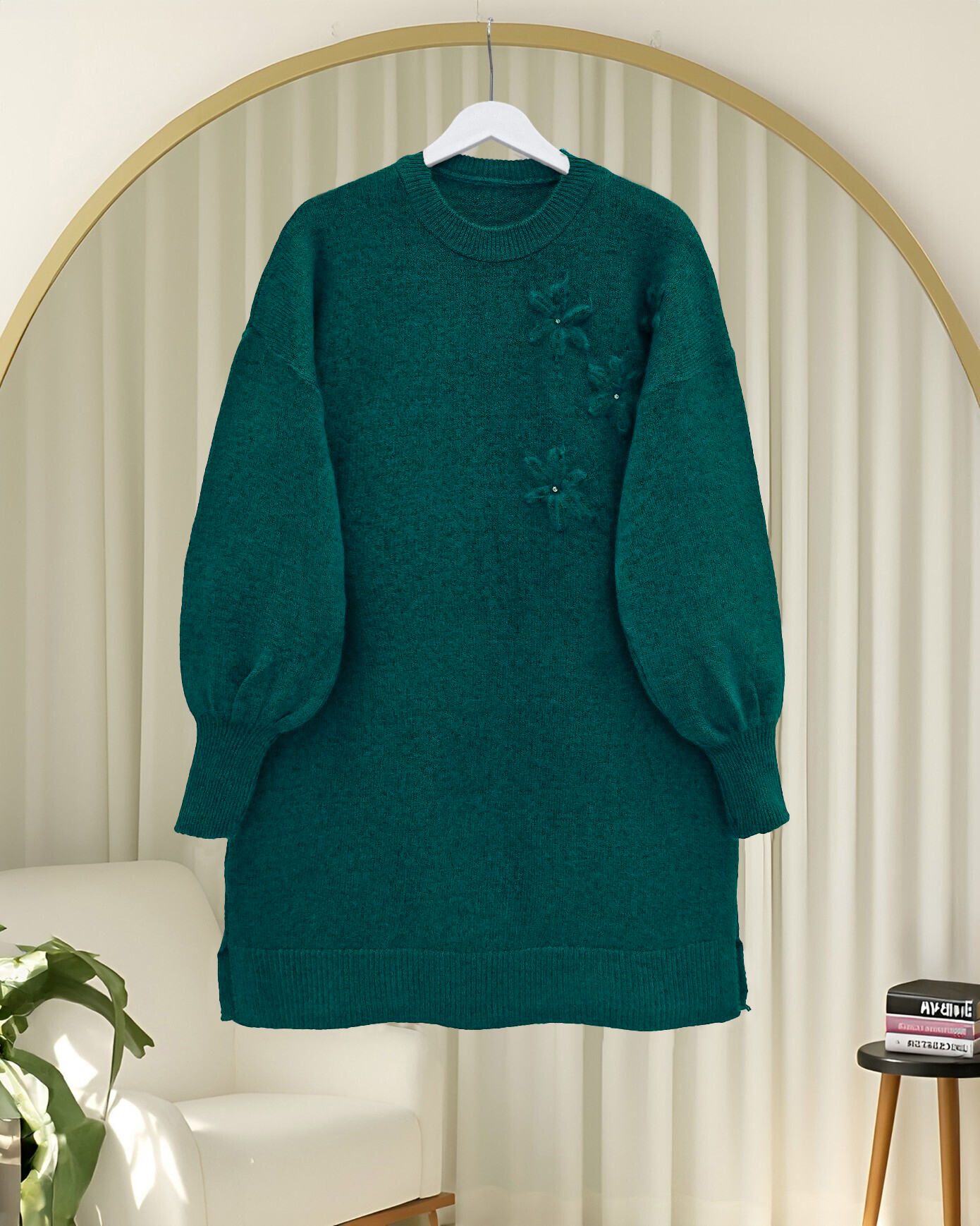 Çiçek Desenli Taşlı Yumoş Triko Kazak -Zümrüt-Zümrüt