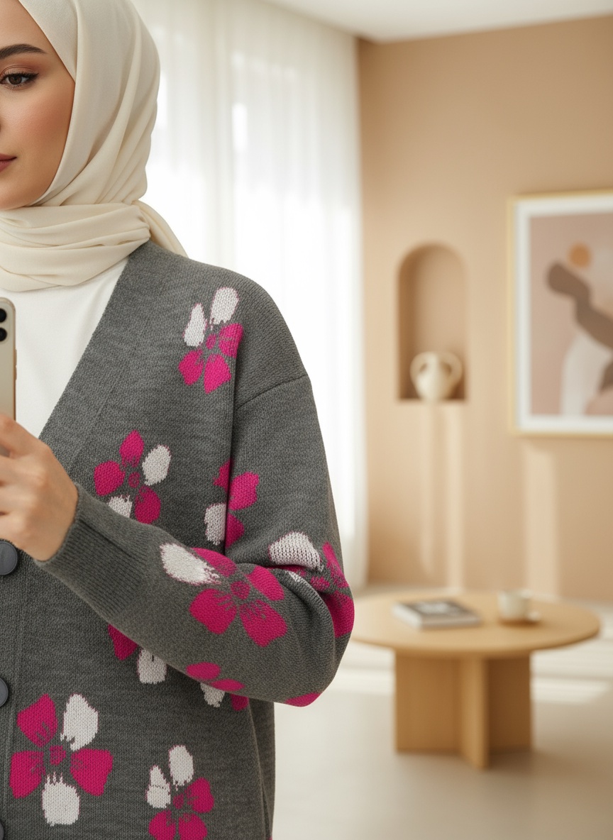 Çiçek Kabartmalı Düğmeli HIrka -Füme-Füme