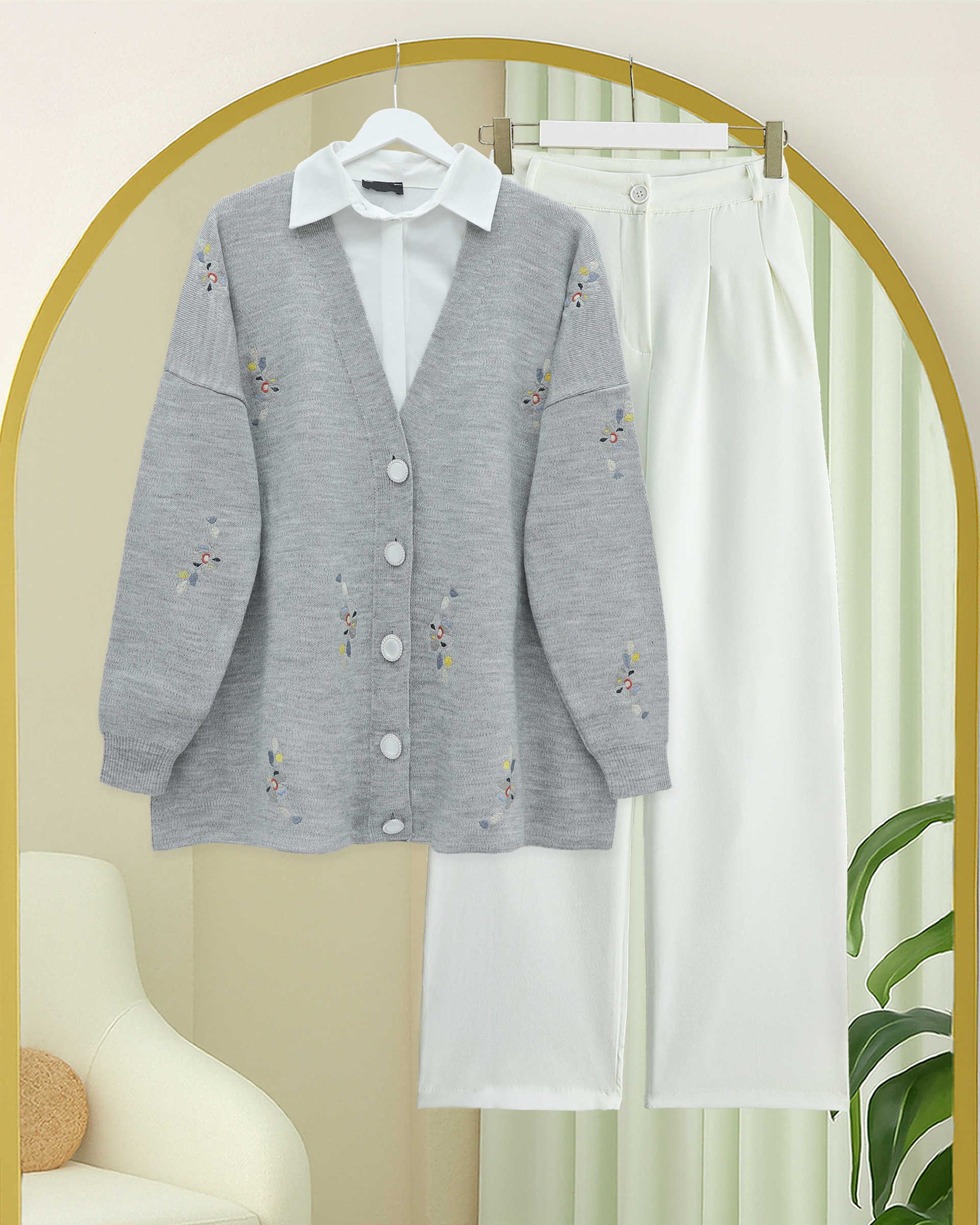 Çiçek Nakışlı Parlak Düğmeli Triko Hırka -Gri-Gri