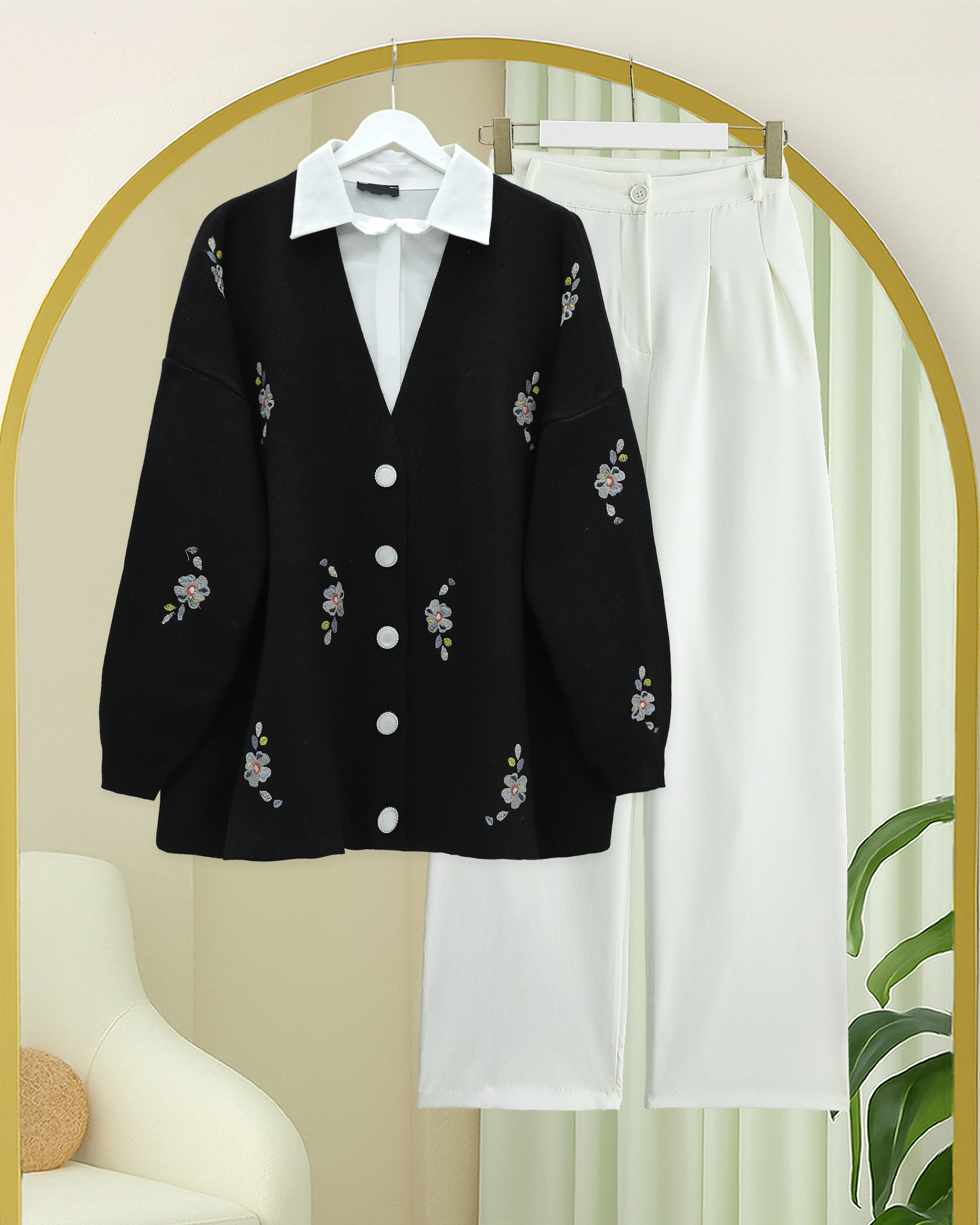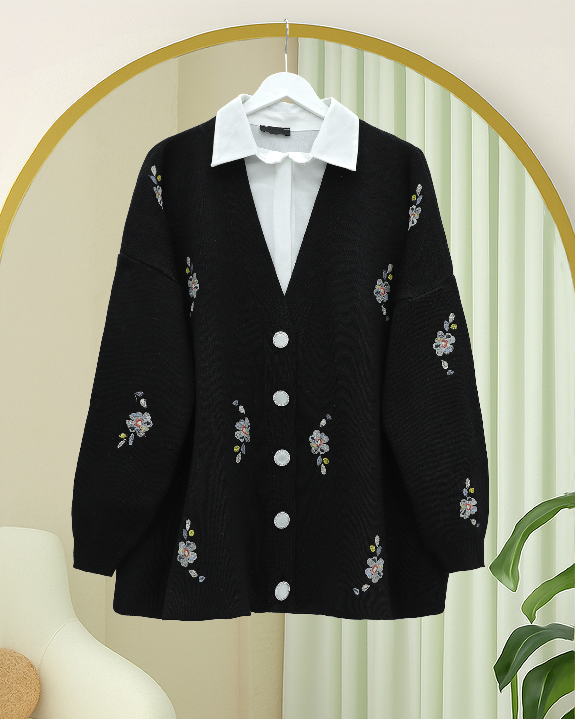 Çiçek Nakışlı Parlak Düğmeli Triko Hırka -Siyah-siyah