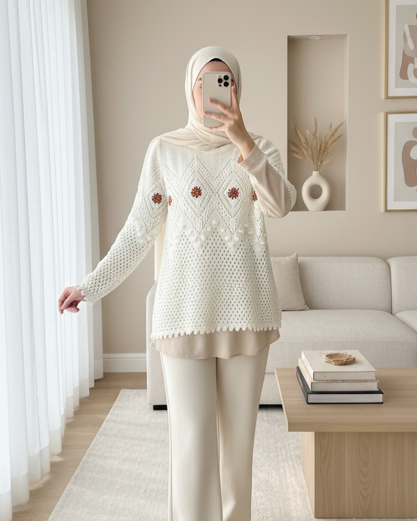 Çiçek Nakışlı Ponpon Örgülü Triko Kazak -Ekru-Ekru