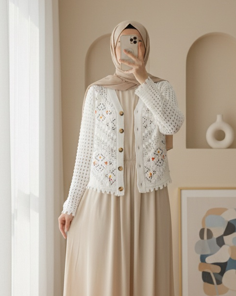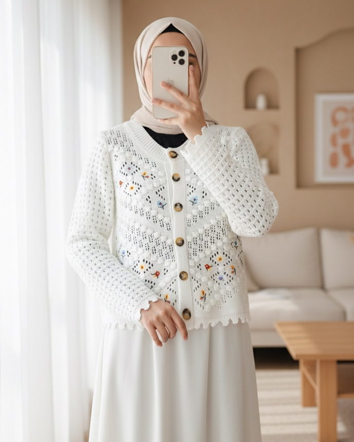 Çiçek Nakışlı Ponponlu Ajurlu Triko Hırka -Ekru-Ekru