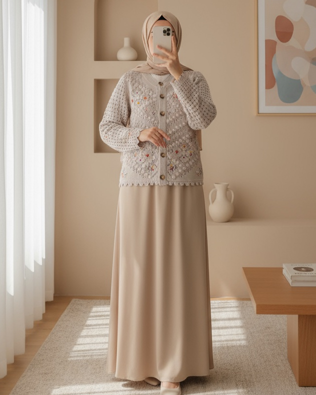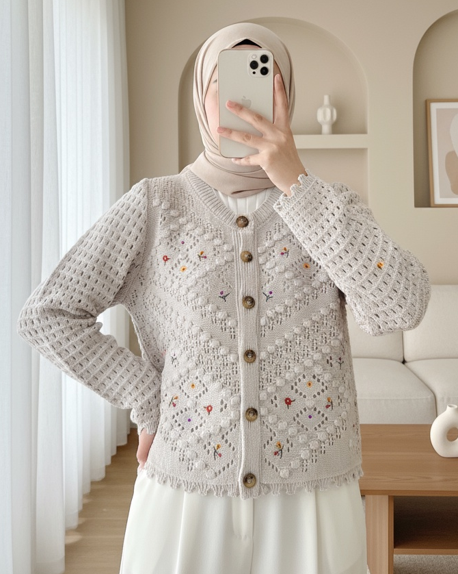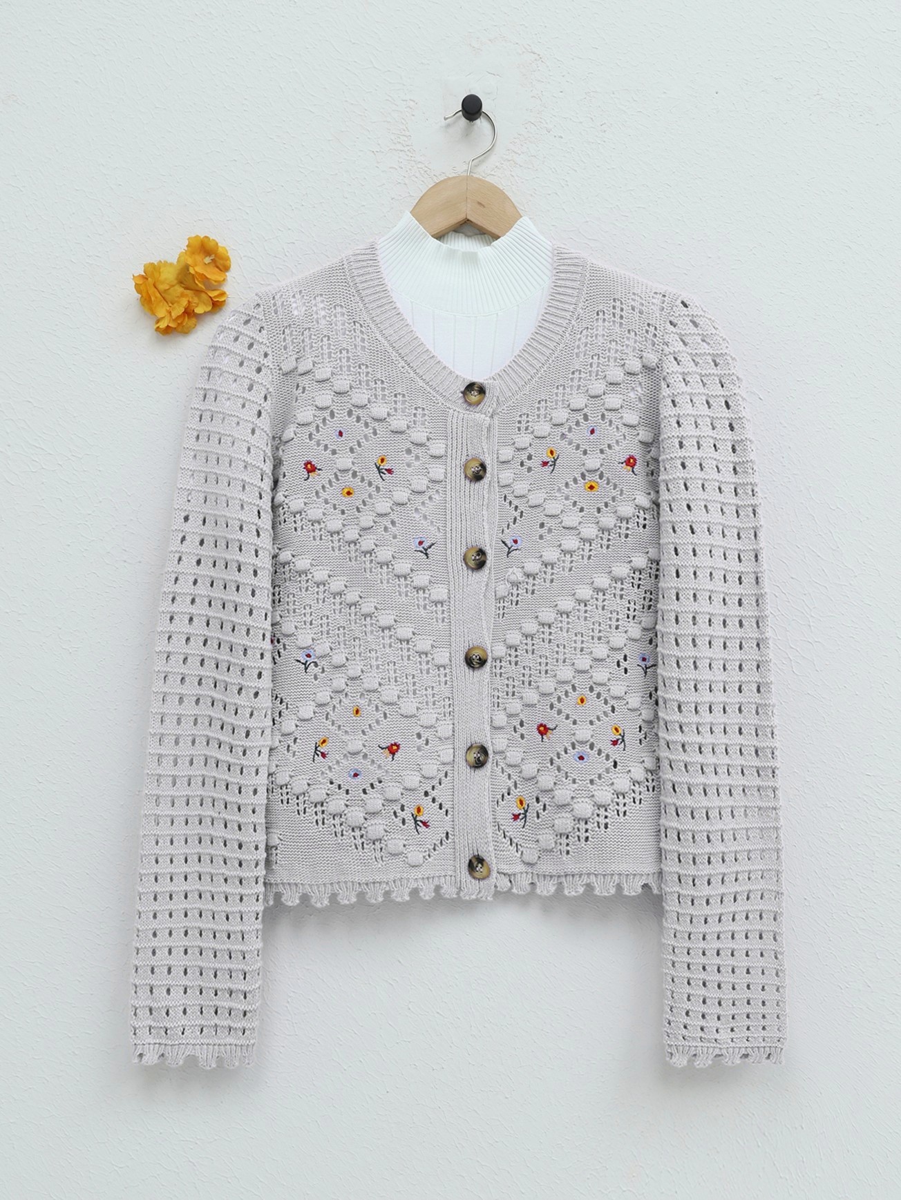 Çiçek Nakışlı Ponponlu Ajurlu Triko Hırka -Taş-Taş