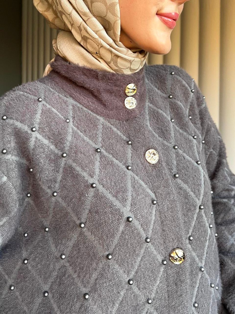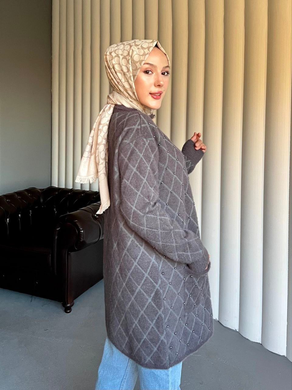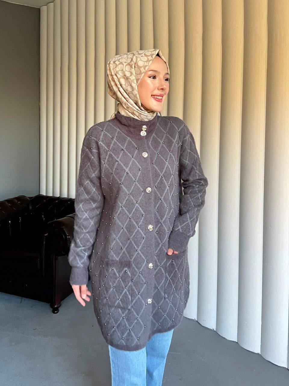 Çift Çepli Baklava Desen İncili Hırka -Füme-Füme