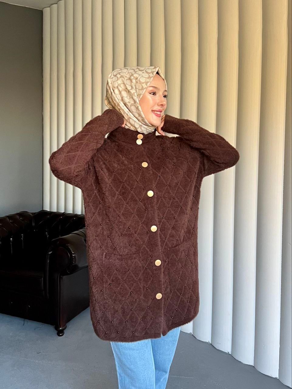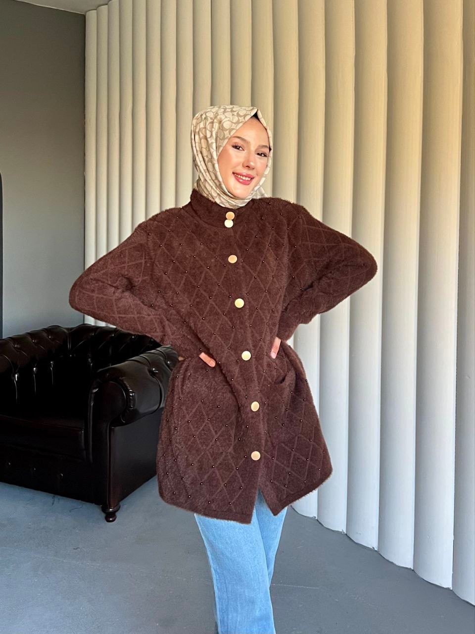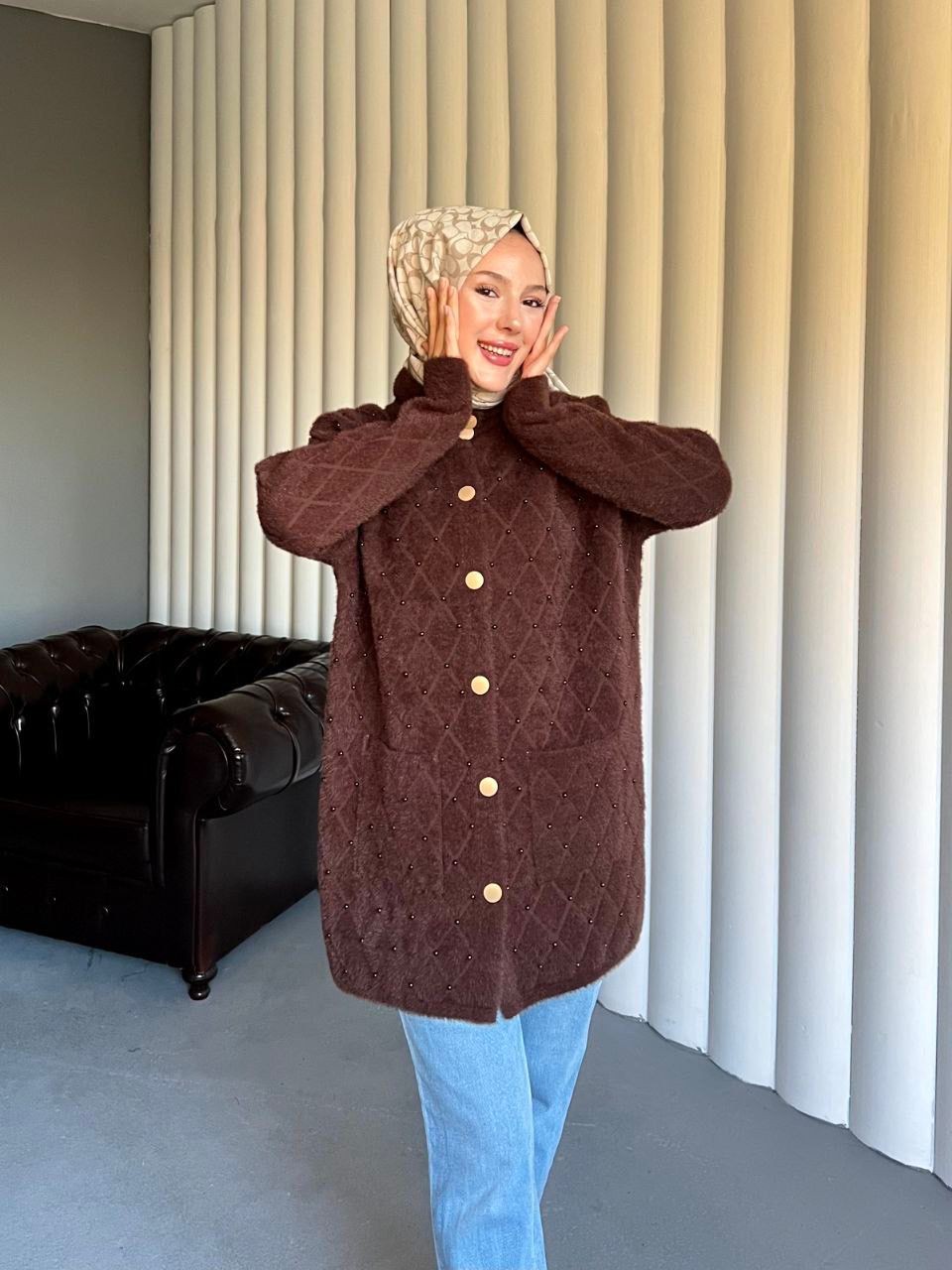 Çift Çepli Baklava Desen İncili Hırka -Kahve-Kahve
