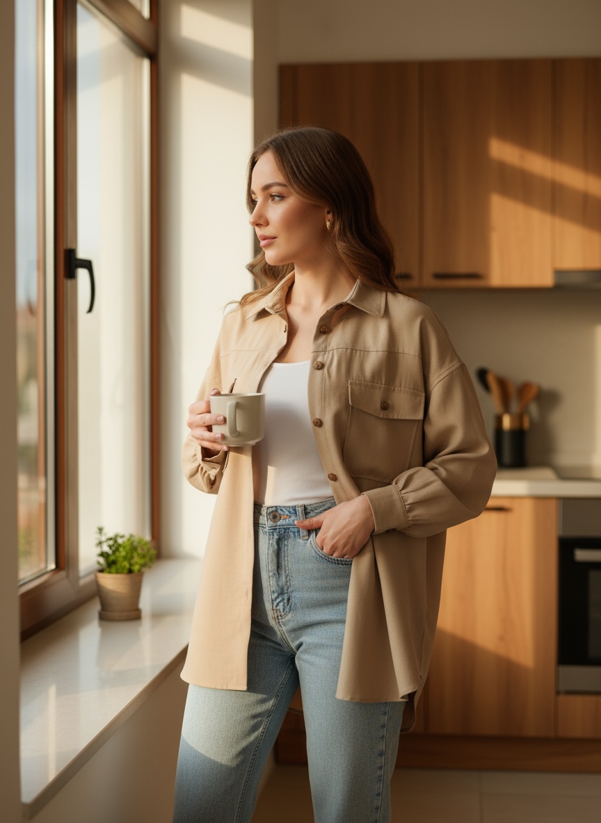 Çift Cepli Boydan Düğmeli Gömlek -Vizon-Vizon