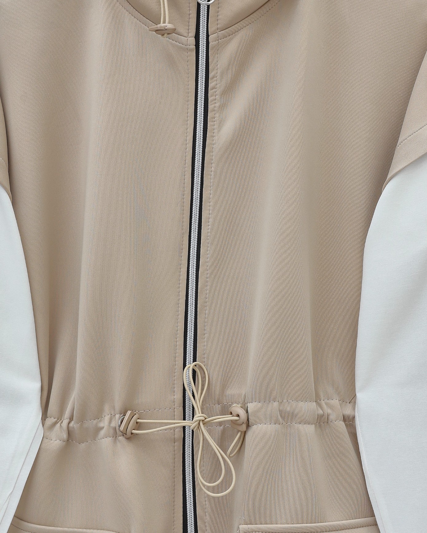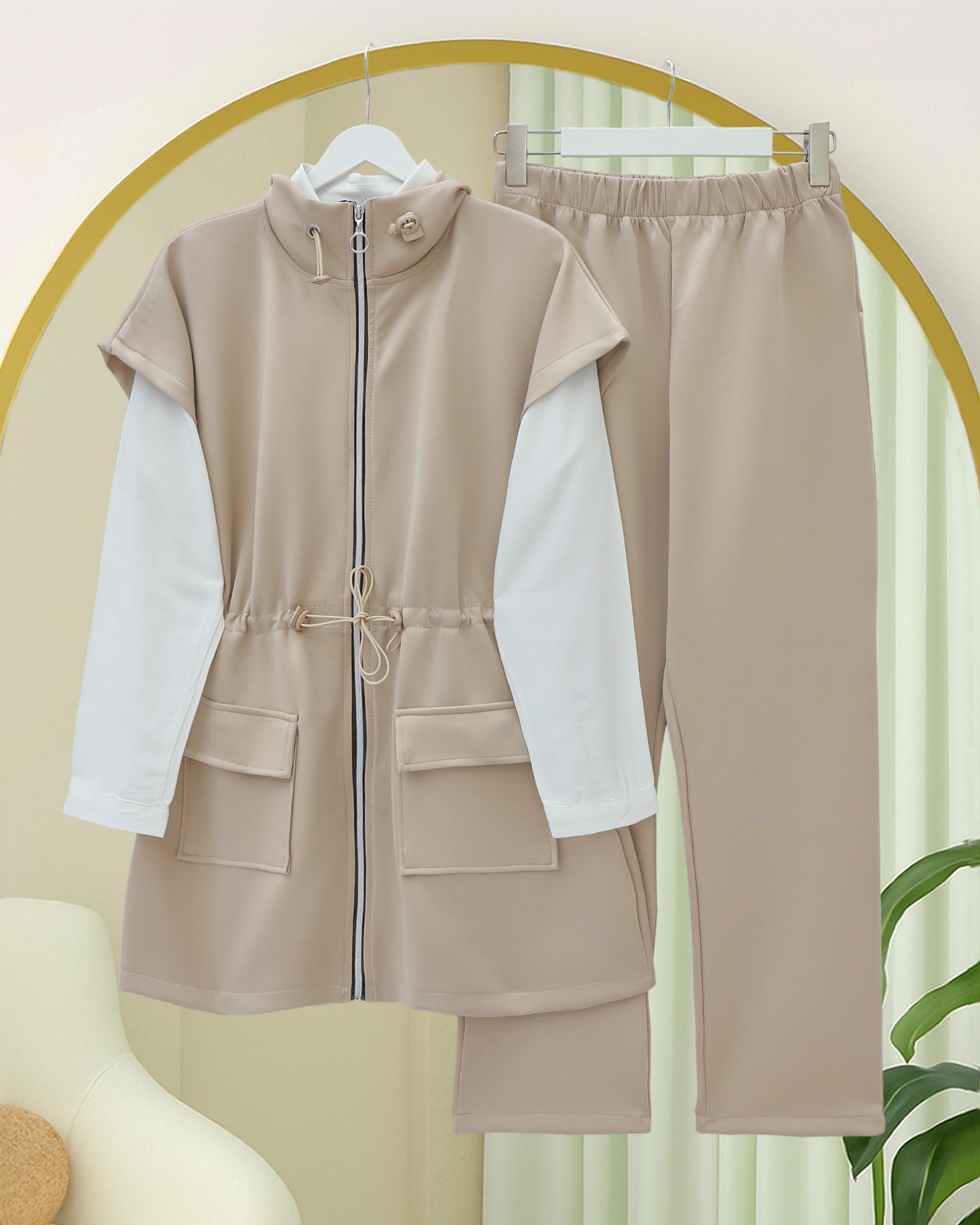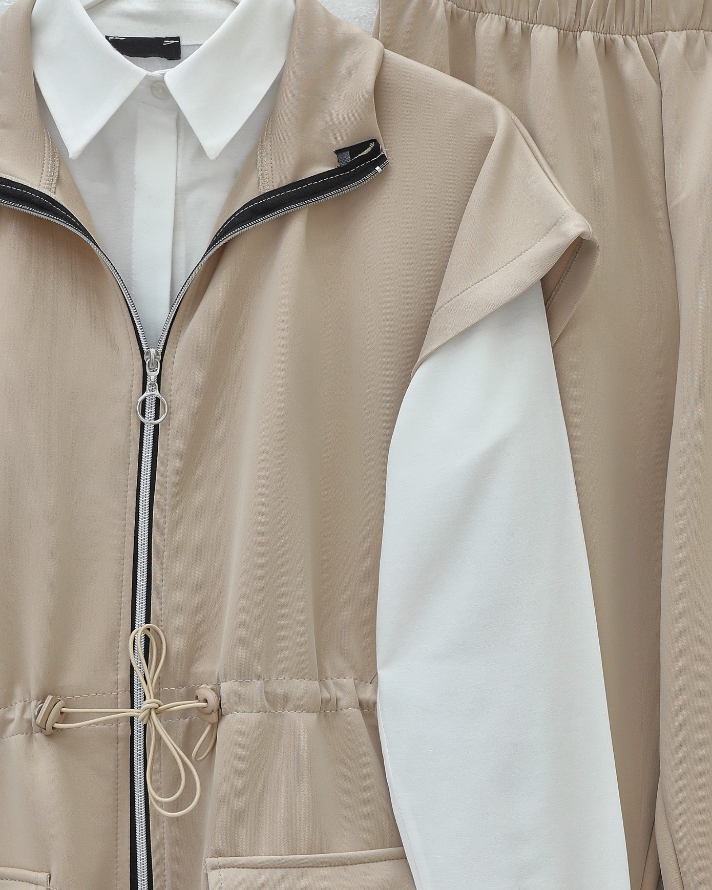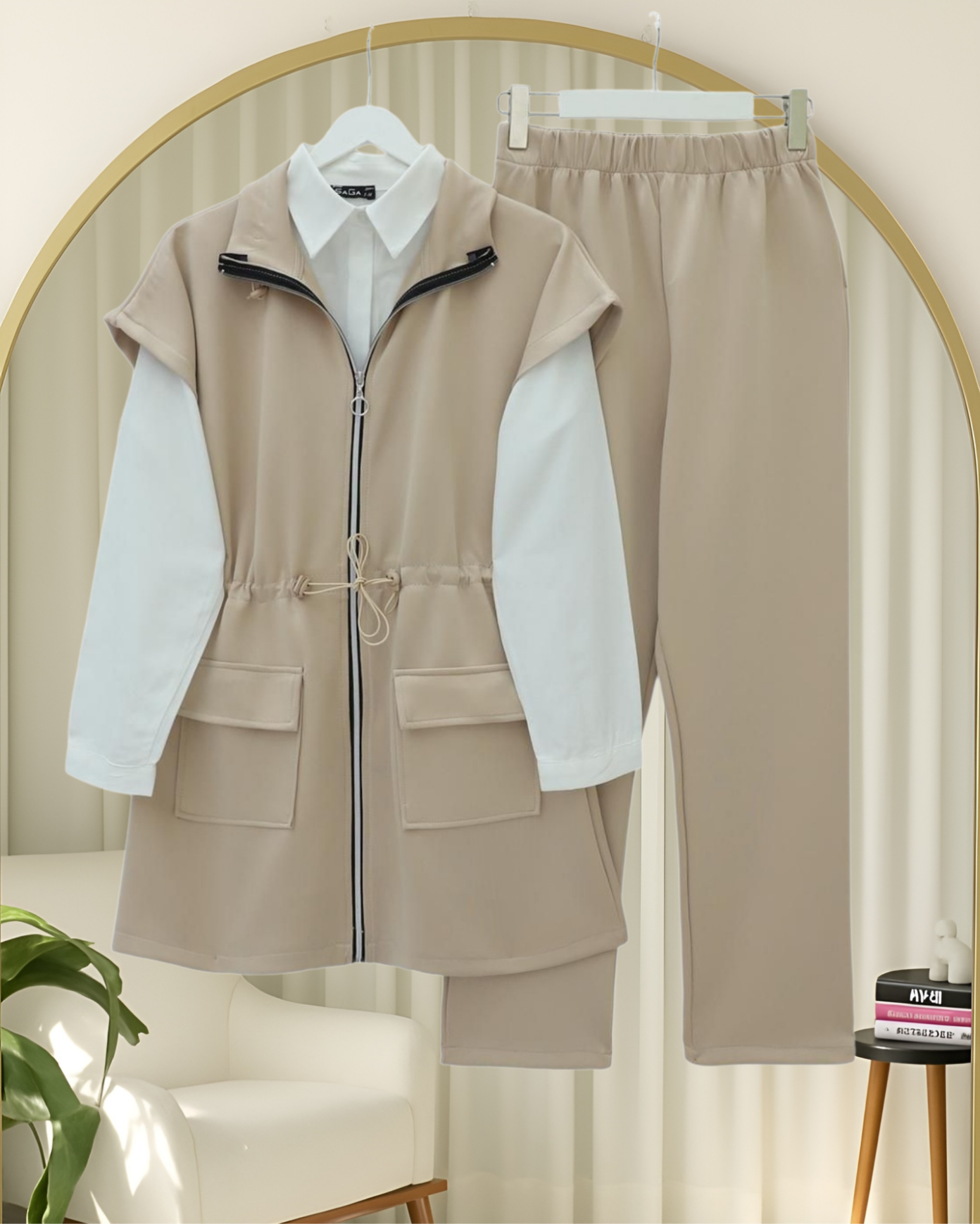 Çift Cepli Fermuarlı Lastik Detaylı Kısakollu Scuba Takım -Bej-Bej