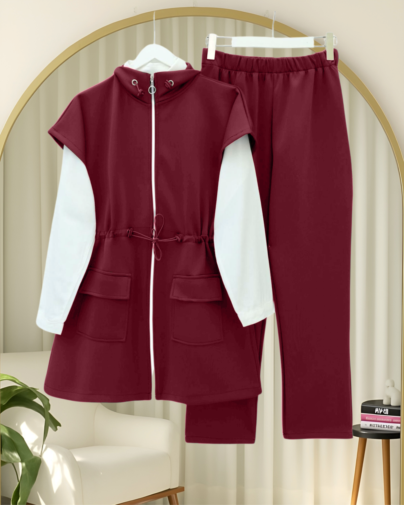 Çift Cepli Fermuarlı Lastik Detaylı Kısakollu Scuba Takım -Bordo-Bordo